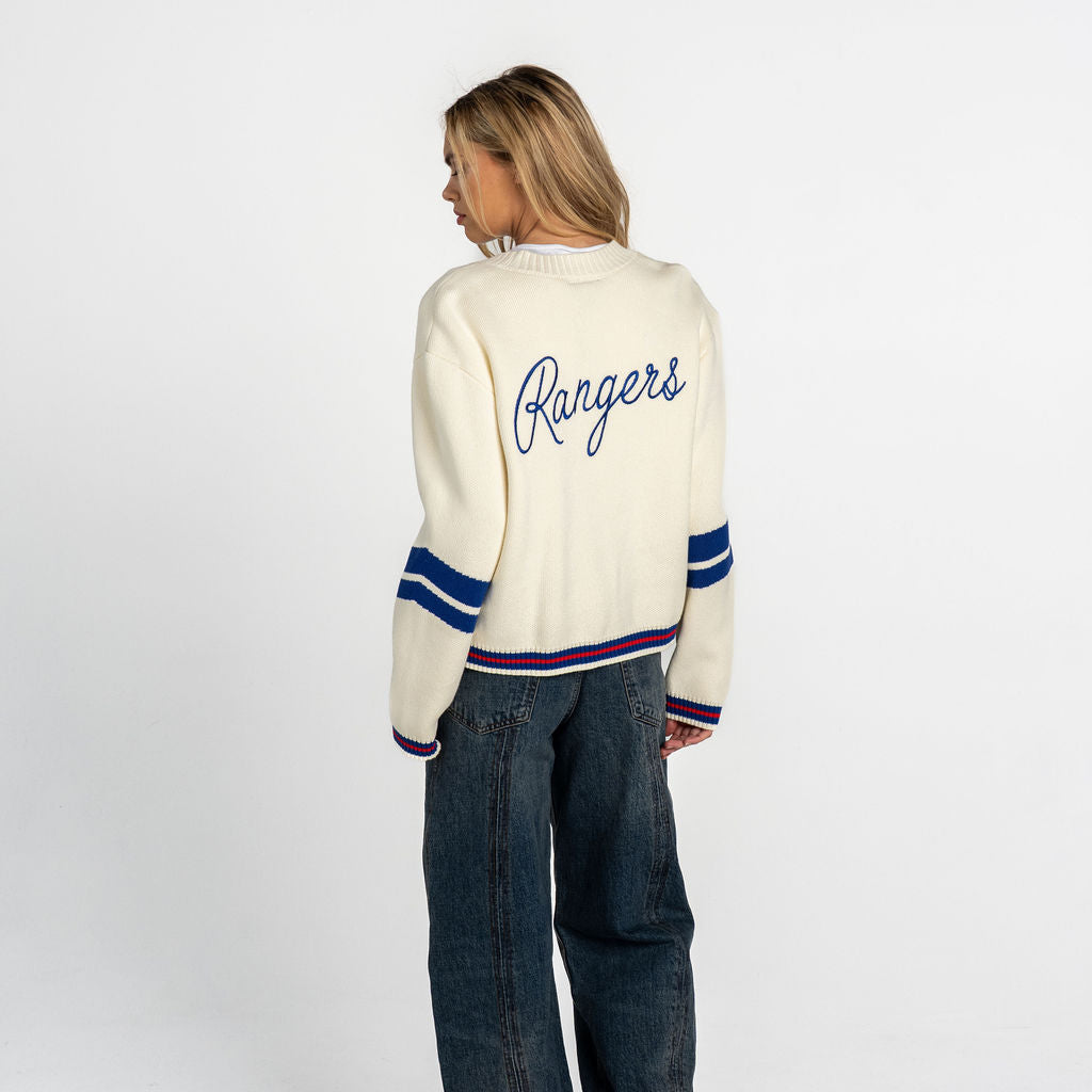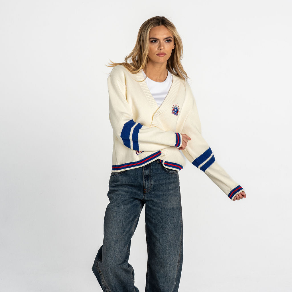 A cream jacquard cardigan featuring New York Rangers detailing for a polished fan essential. The women’s fit allows for easy layering and everyday wear. Model is wearing a small.