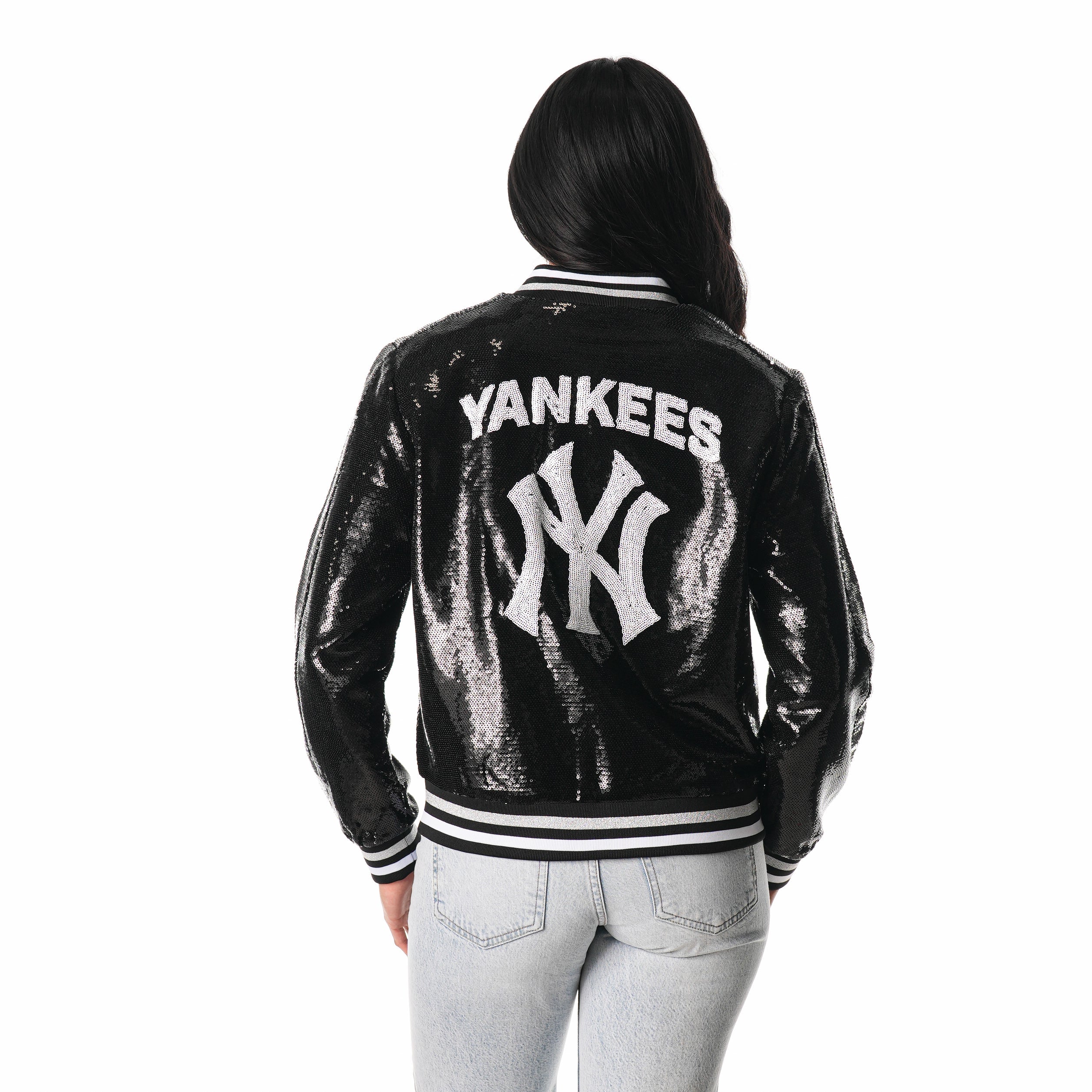 Make a statement with the NY Yankees Sequin Bomber in black. Featuring bold sequin details and the iconic Yankees logo, this jacket adds a sleek and stylish touch to your game day look.