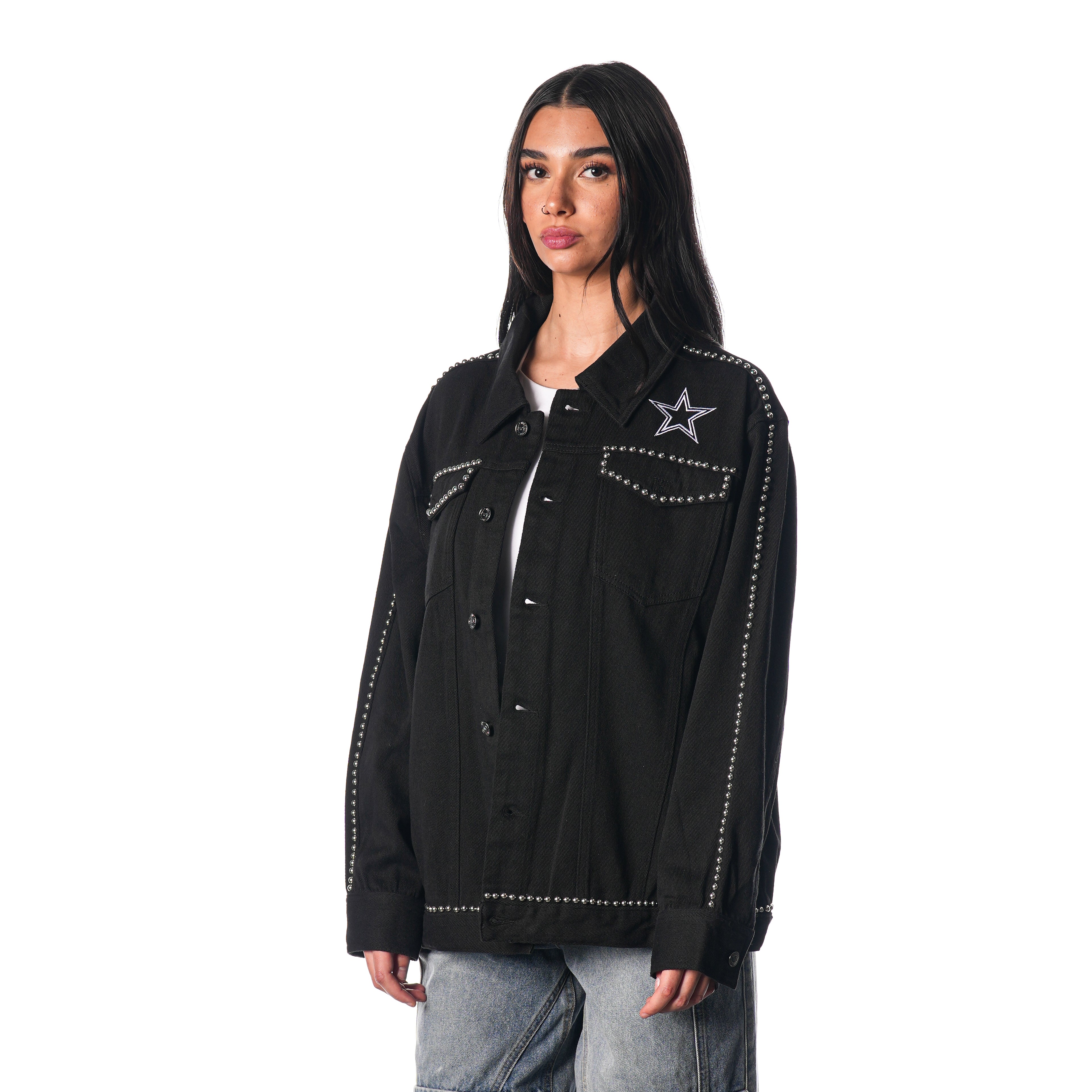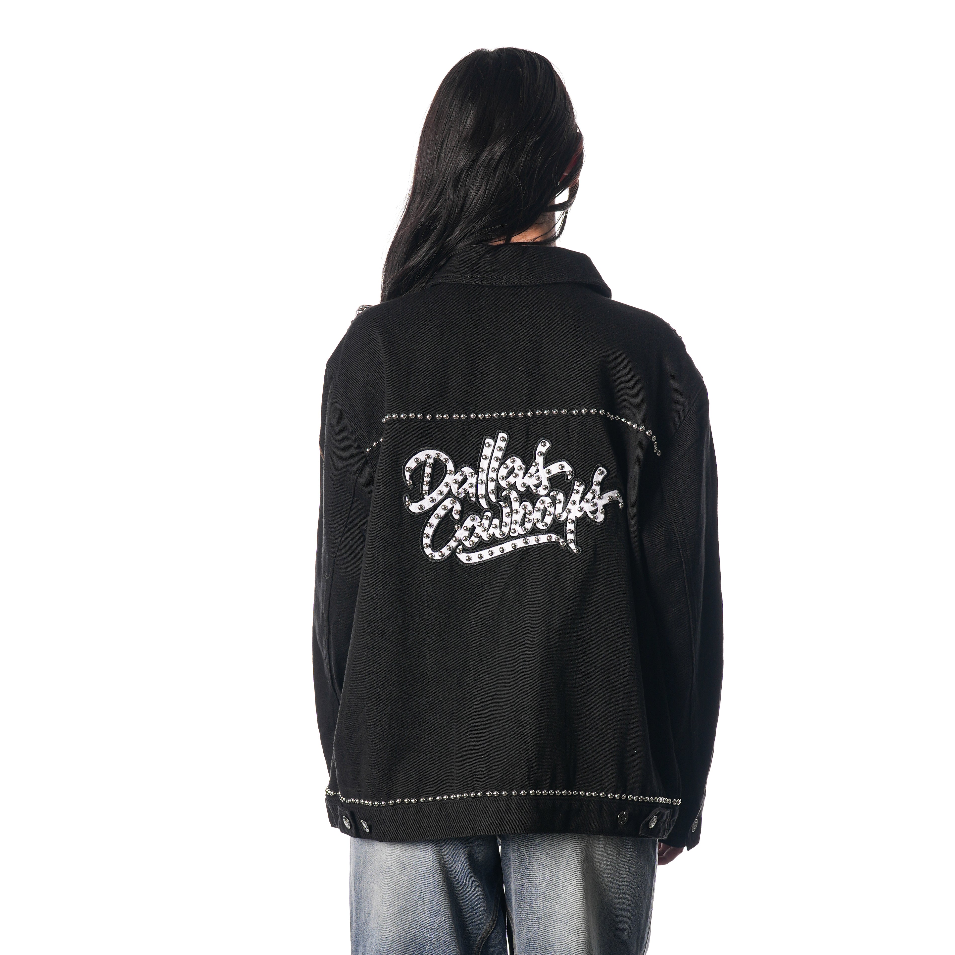 Stay stylish and show off your team pride with the DALLAS COWBOYS DENIM STUDDED JACKET. Made with high-quality denim and studded with the team's logo, this jacket is perfect for any fan. Stay warm and fashionable while supporting your favorite team.