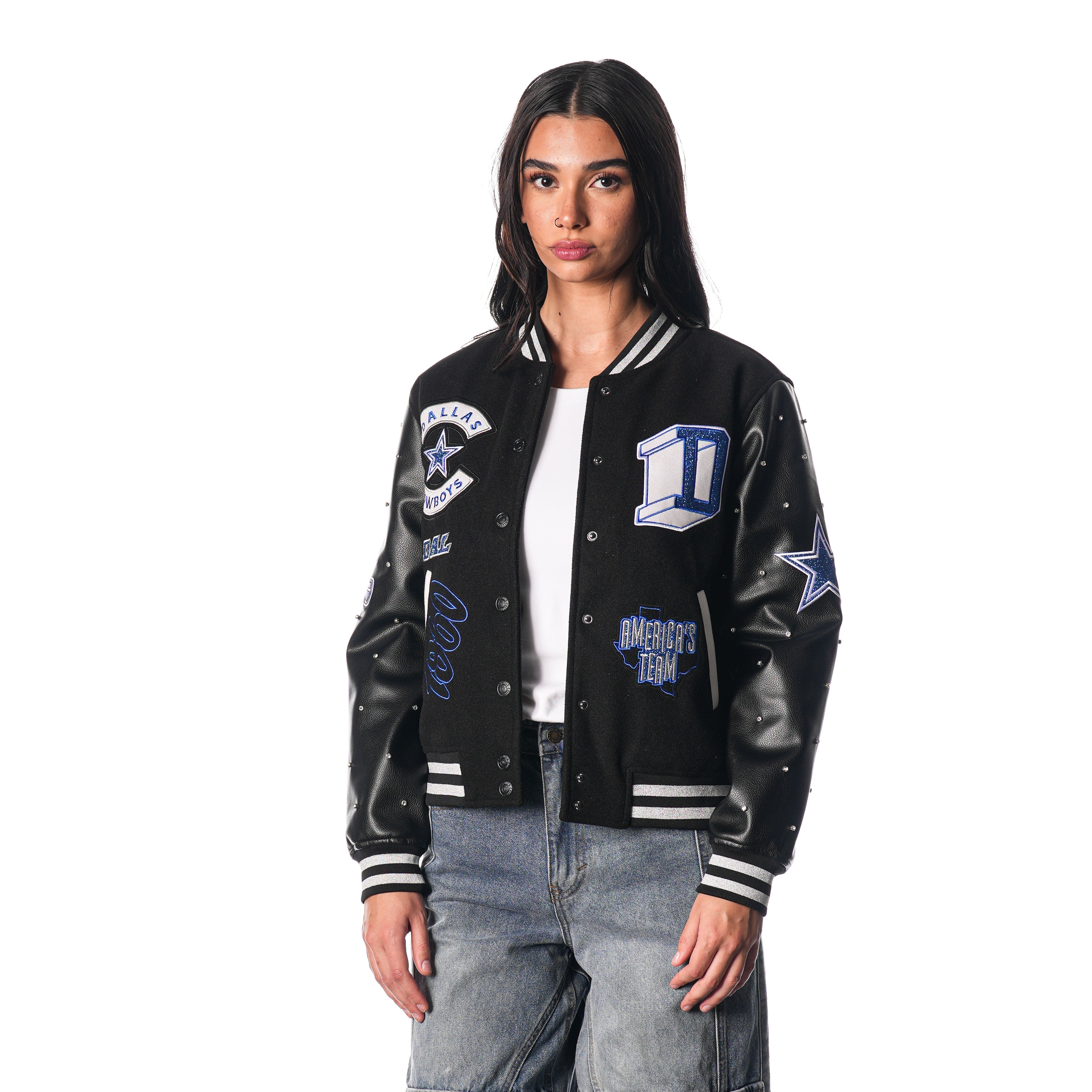 Stay warm while showing off your team spirit with our DALLAS COWBOYS VARSITY SPARKLE JACKET in sleek black. Perfect for game day or everyday wear, this jacket features the iconic Cowboys logo and added sparkle for a touch of glam. Cheer on your favorite team in style all season long.