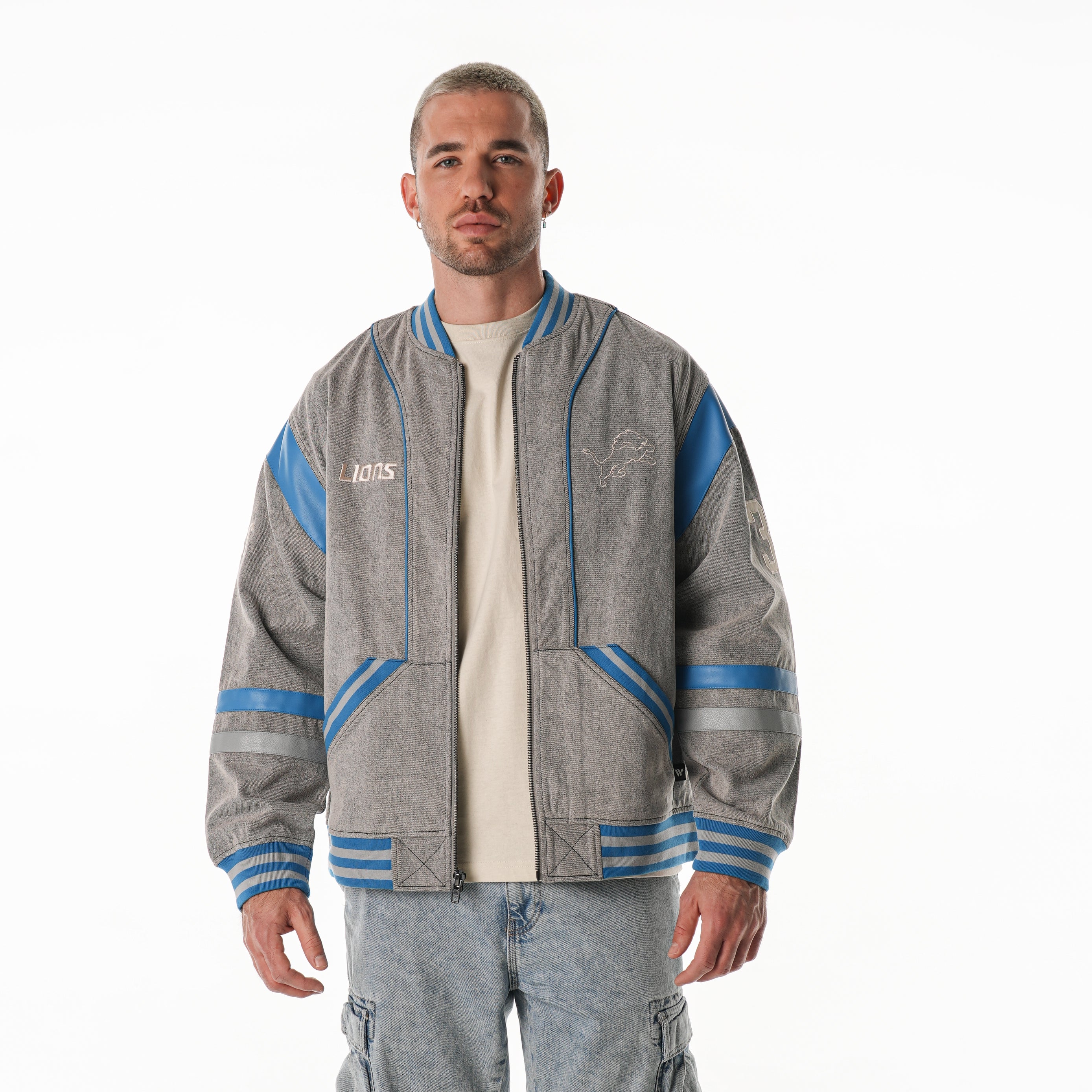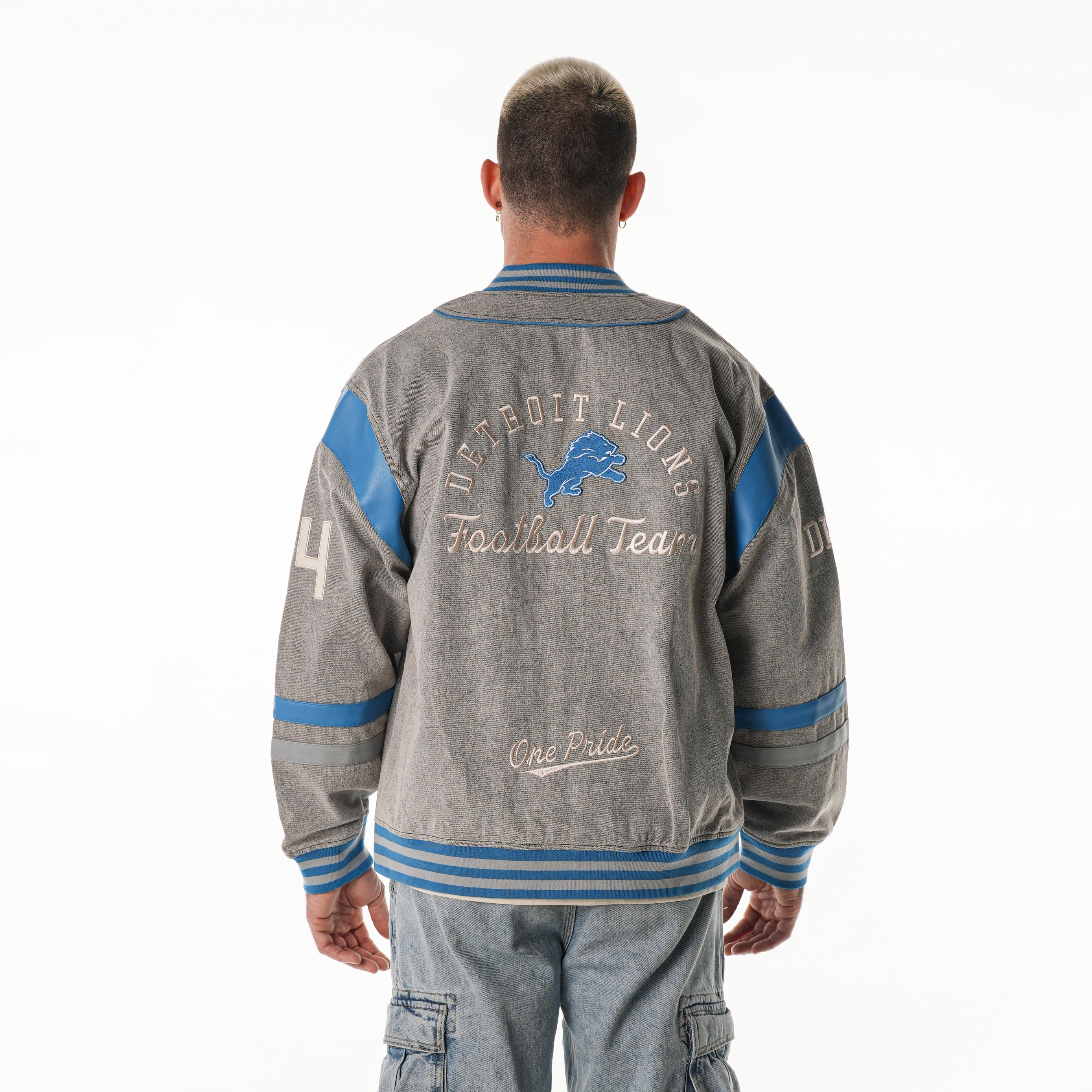 Rep the Lions in this retro oversized denim jacket, designed in washed grey with Honolulu Blue accents. Front team hits and an oversized back graphic bring vintage vibes—perfect for game day or everyday wear.