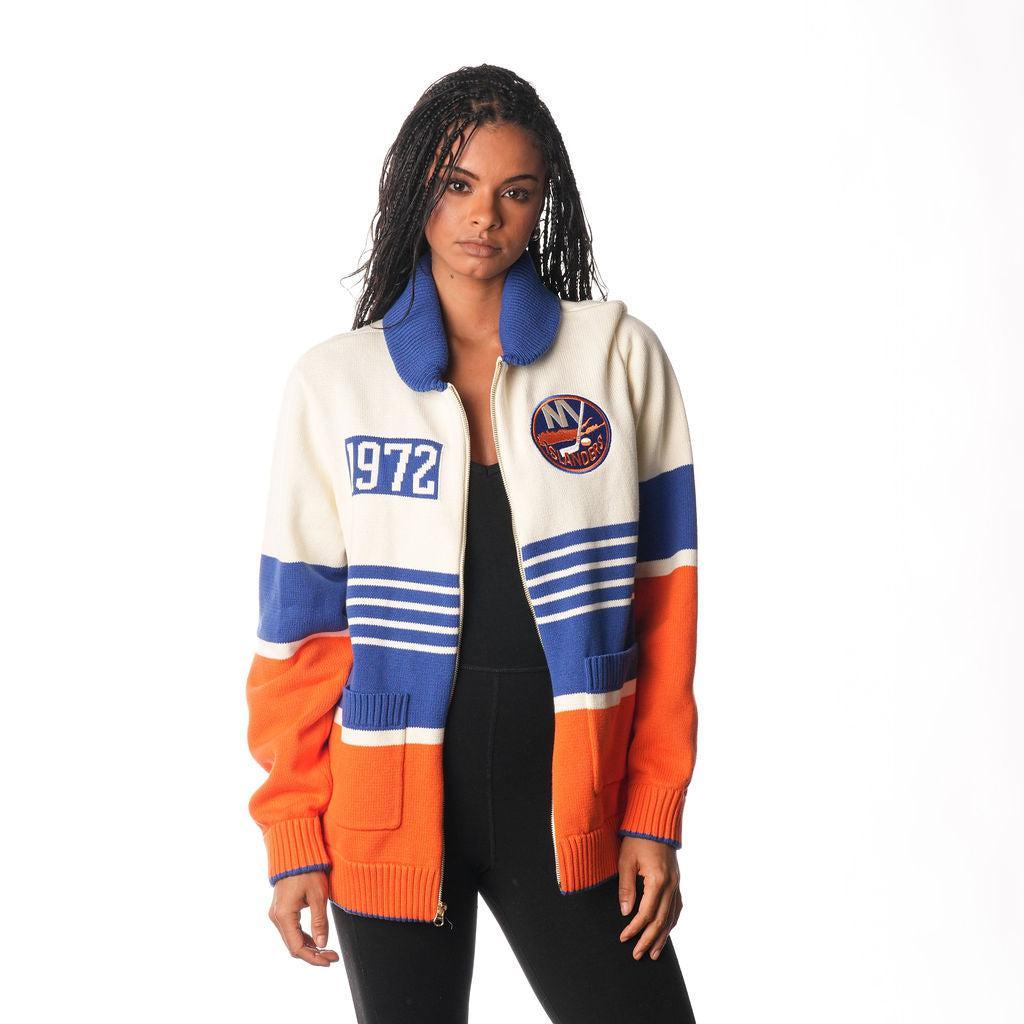 Stay warm and stylish with our NY Islanders Full Zip Jacquard Sweater. Made from 100% cotton, this colorblock sweater features a full zip and chic Chicago Blackhawks jacquard design. Perfect for game nights or casual outings, you'll love the comfort and versatility of this sweater.