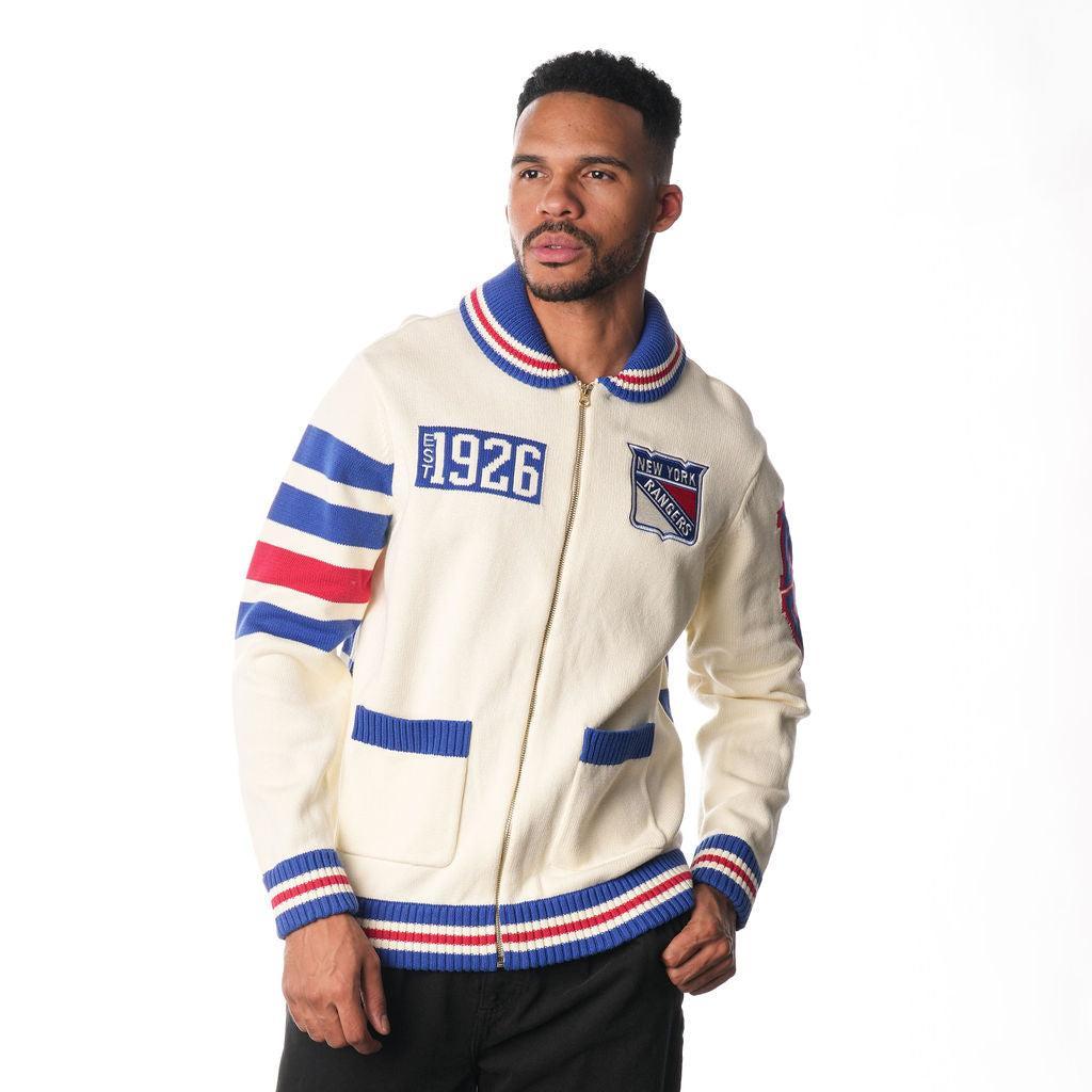 The New York Rangers Cream Jacquard Sweater features a premium knit design with intricate team detailing, offering a stylish way to show your Rangers pride.