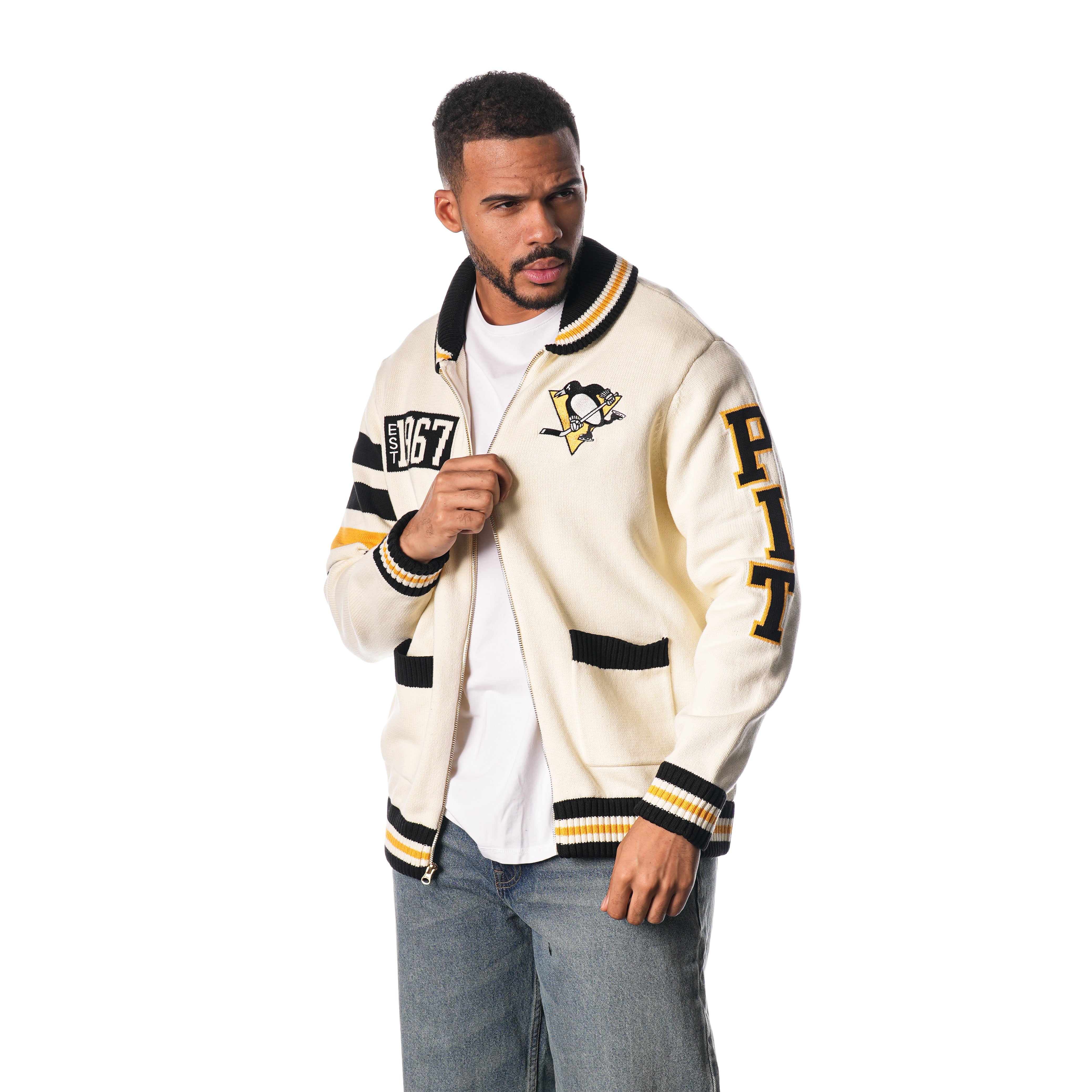 Stay cozy and show off your team pride with this Pittsburg Penguins Jacquard Sweater. Made with cream-colored jacquard fabric, this sweater features the iconic Pittsburgh Penguins logo. Perfect for game days or everyday wear, this sweater is a must-have for any fan.