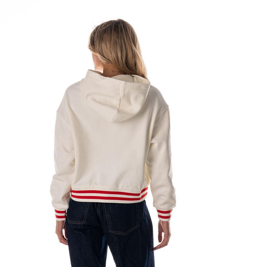 This cropped hoodie features bold, vintage-inspired front graphics that showcase the Canes’ logo and hockey heritage. Designed in a soft vintage white fleece with striped rib-knit hem and cuffs, it blends throwback details with a contemporary fit. Perfect for layering on game day or wearing as a streetwear staple, this hoodie delivers effortless team spirit and standout style.
