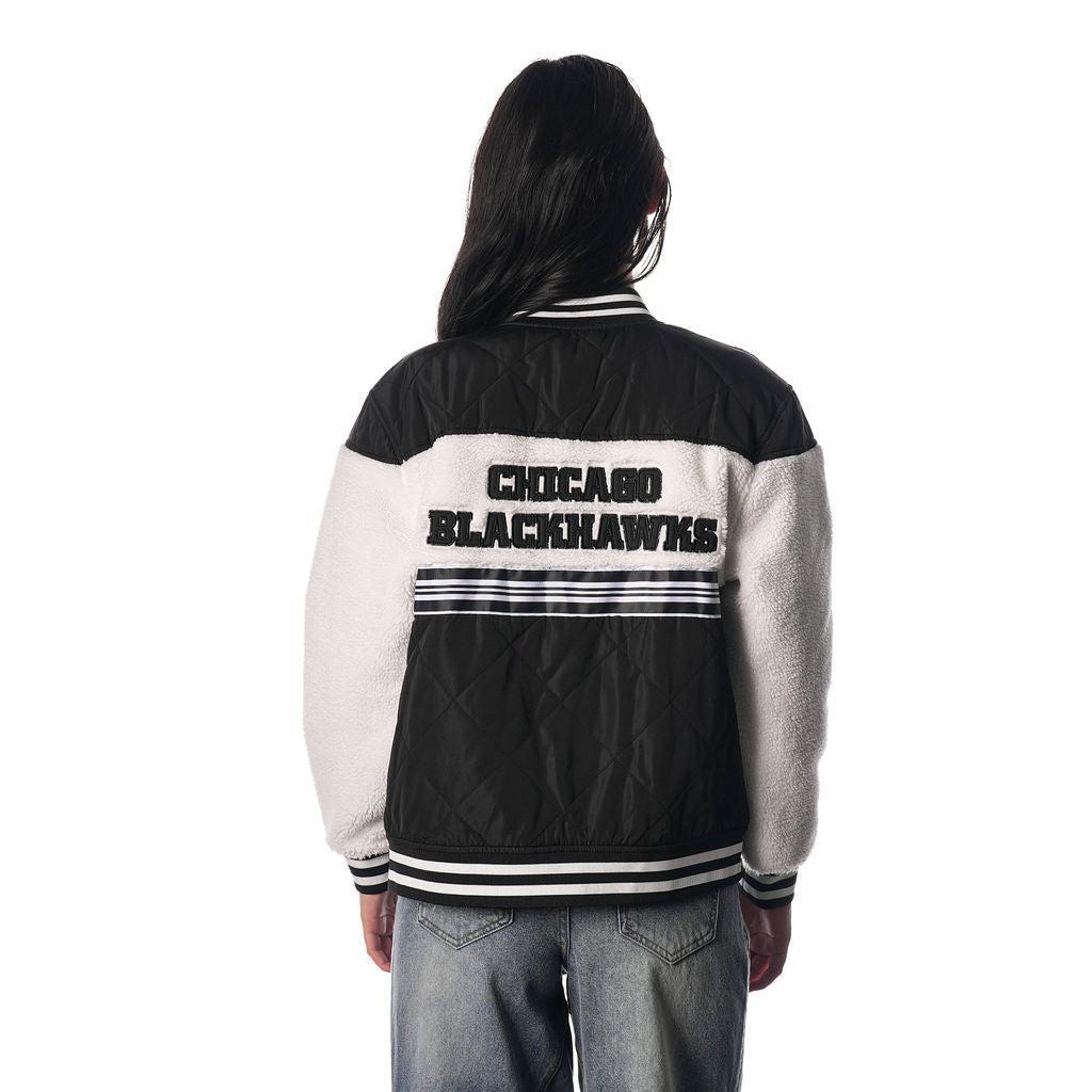 The Chicago Blackhawks Quilted Sherpa Bomber in black combines warmth and style with a quilted design and cozy sherpa lining. Featuring subtle team branding, it's a must-have for Blackhawks fans looking for both comfort and team spirit.