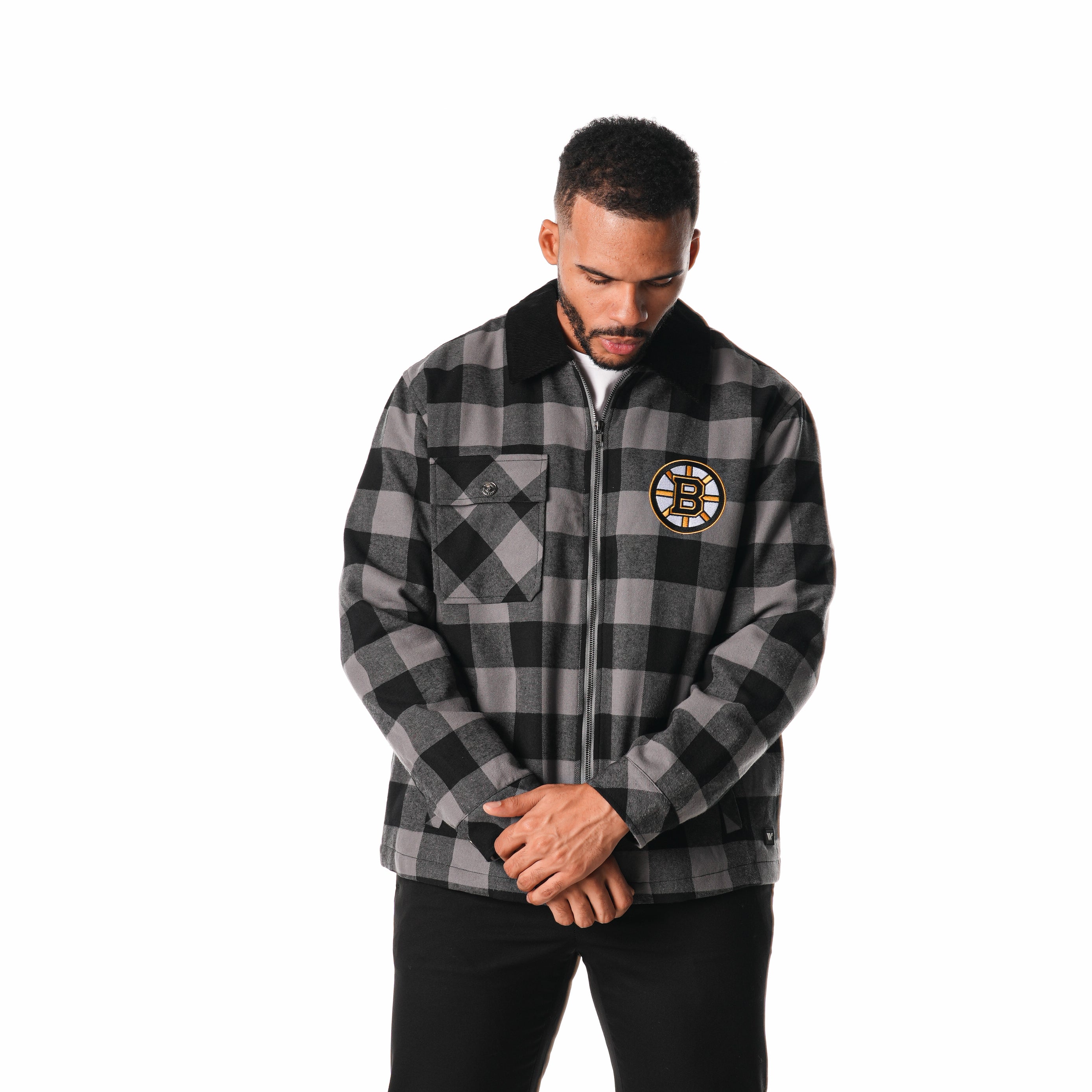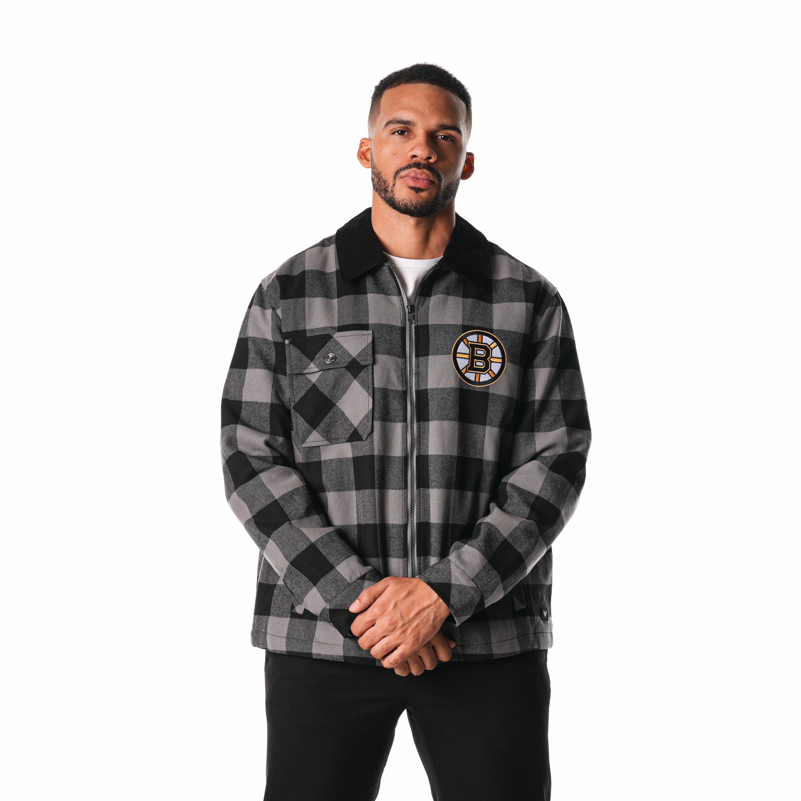 Stay warm and stylish with this BOSTON BRUINS FLANNEL ZIP FRONT JACKET in black. Stay true to your team while enjoying the comfort of flannel and the convenience of a front zipper. Perfect for outdoor activities or casual days.