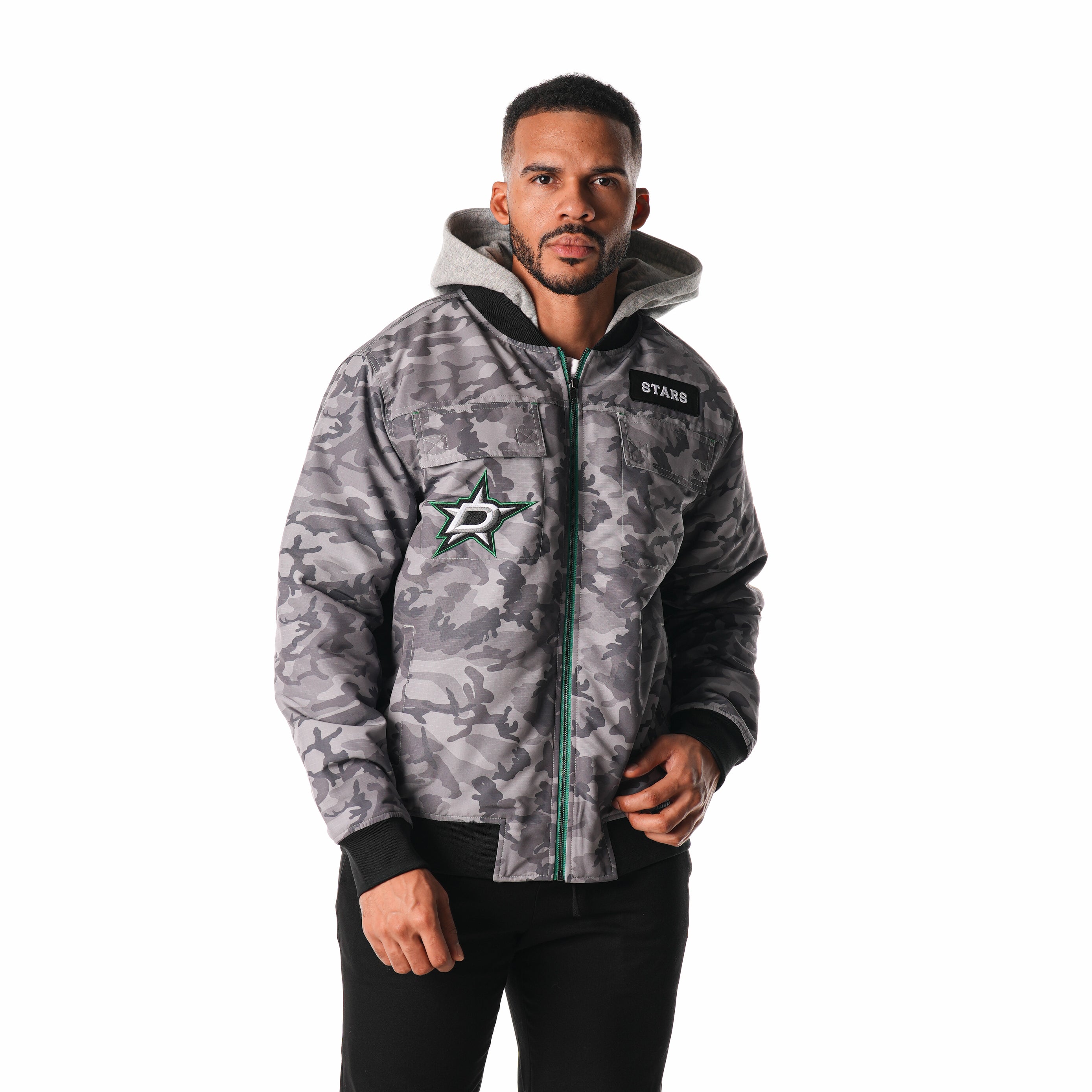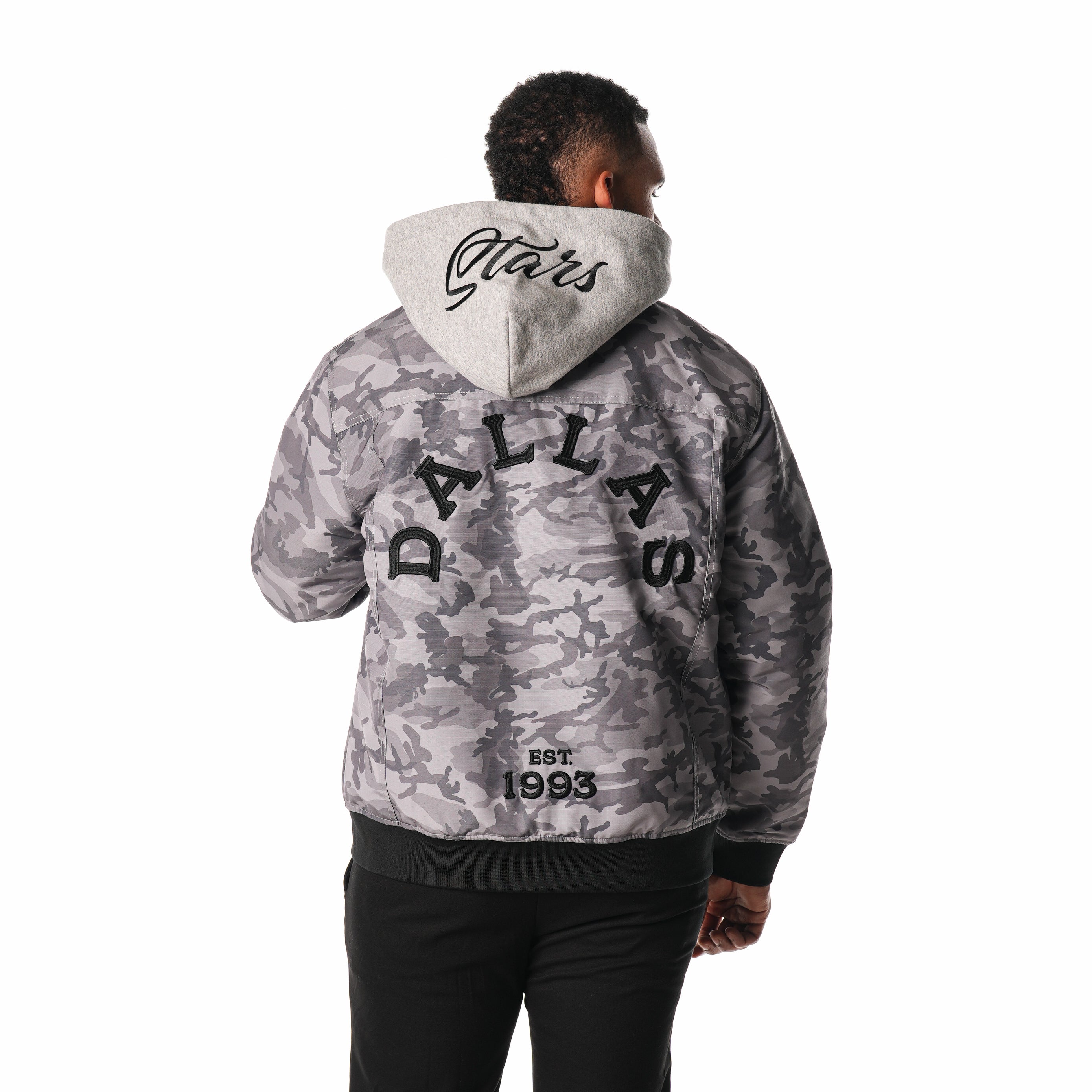 Blend in with the camo, stand out with the swagger. This Dallas Stars bomber jacket levels up your cold-weather lineup with an allover camo print, embroidered team patches, and a built-in layered hood look. The back reads “Dallas EST. 1993,” while the hoodie spells out “Stars” so there's no mistaking who you're repping.