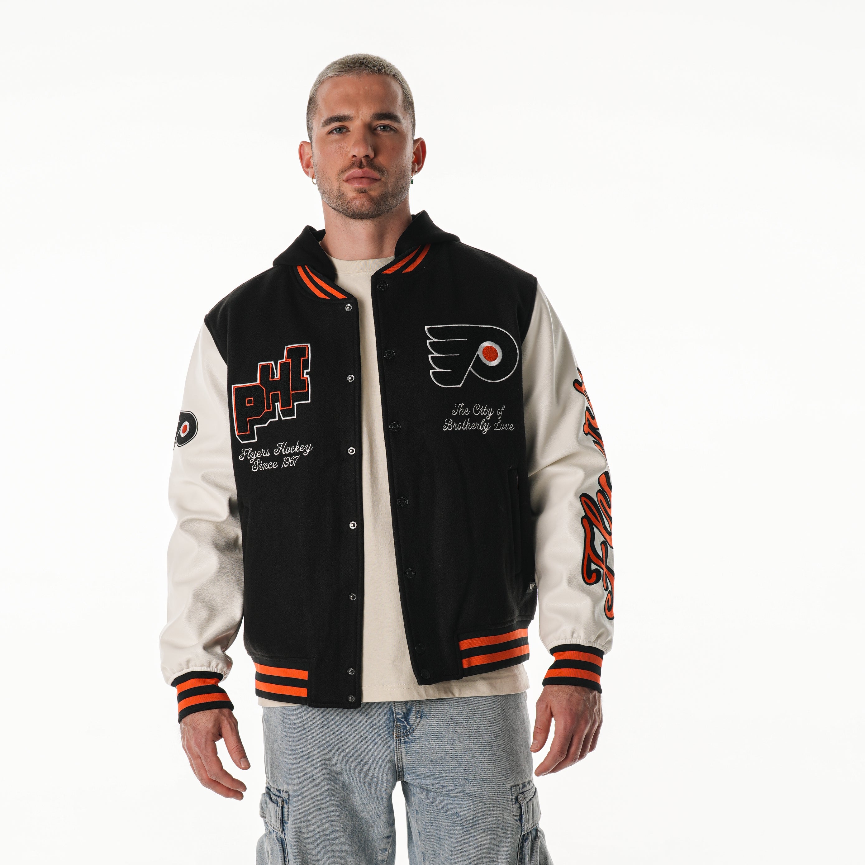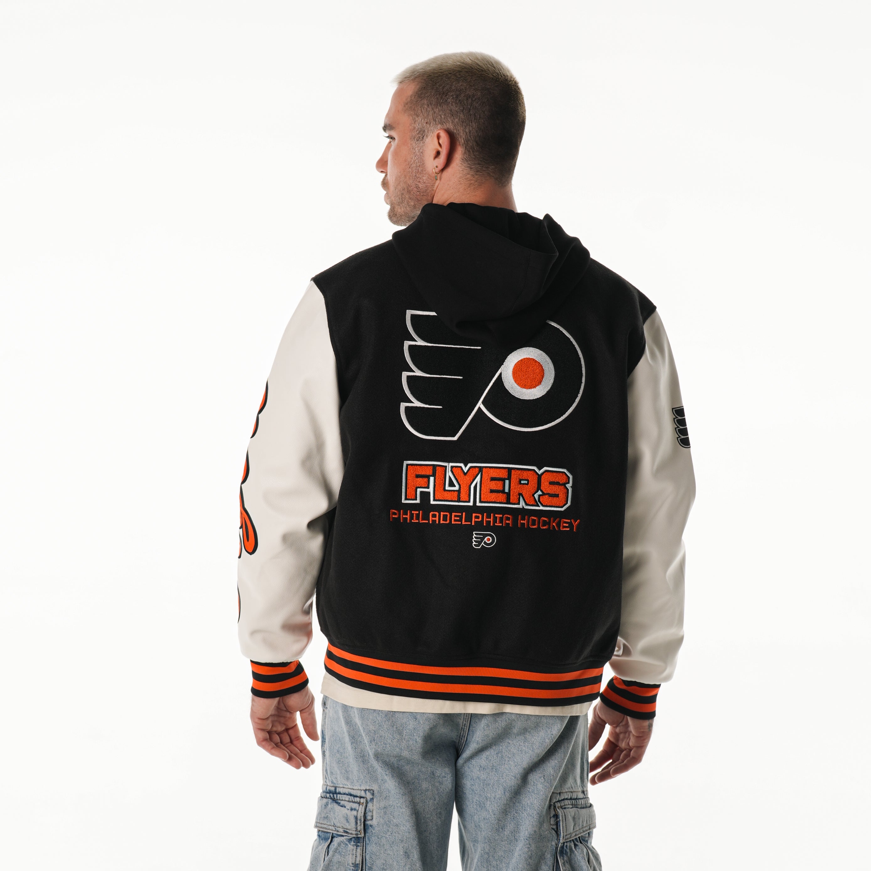 This jacket brings serious game-day energy. The Philadelphia Flyers Hooded Varsity Jacket combines bold team graphics with classic varsity styling and added comfort from a built-in hood. Featuring embroidered logos on the chest, sleeves, and back, contrast faux leather sleeves, and striped knit cuffs and hem, this jacket doesn’t hold back on detail or attitude. It’s built to keep you warm and stand out.