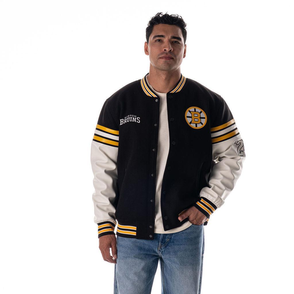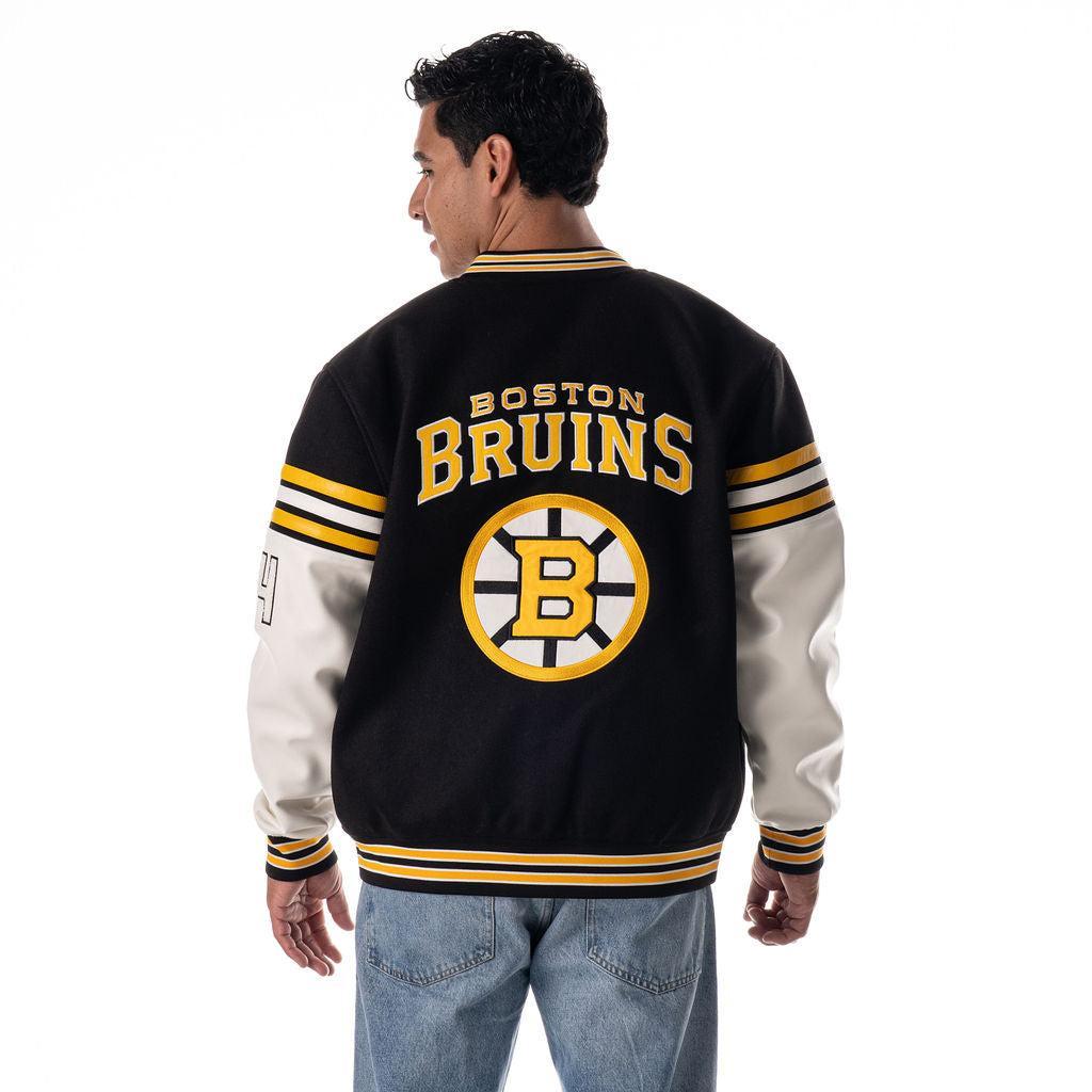 This drop-shoulder jacket features bold embroidered graphics on the chest, sleeves, and back, showcasing the iconic Boston Bruins logo with standout detail. Designed with contrast faux-leather sleeves, striped rib-knit trim, and a relaxed fit, it delivers a modern update to a timeless silhouette. Whether at the rink or on the street, this jacket brings heritage sportswear and fashion-forward edge together.