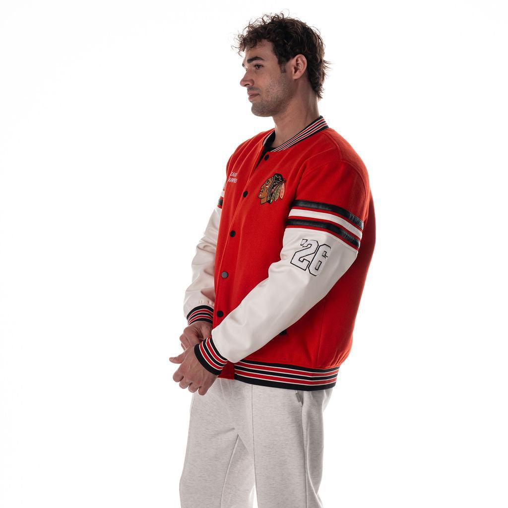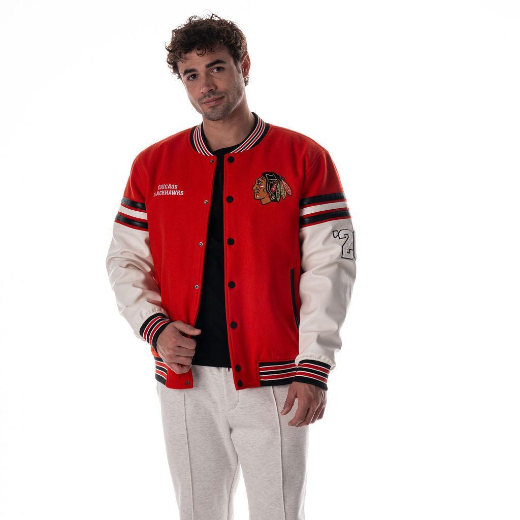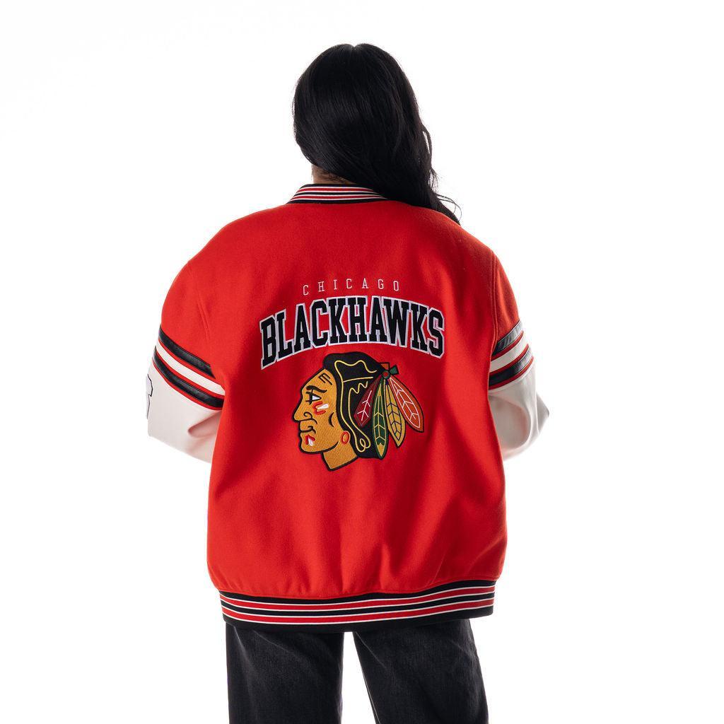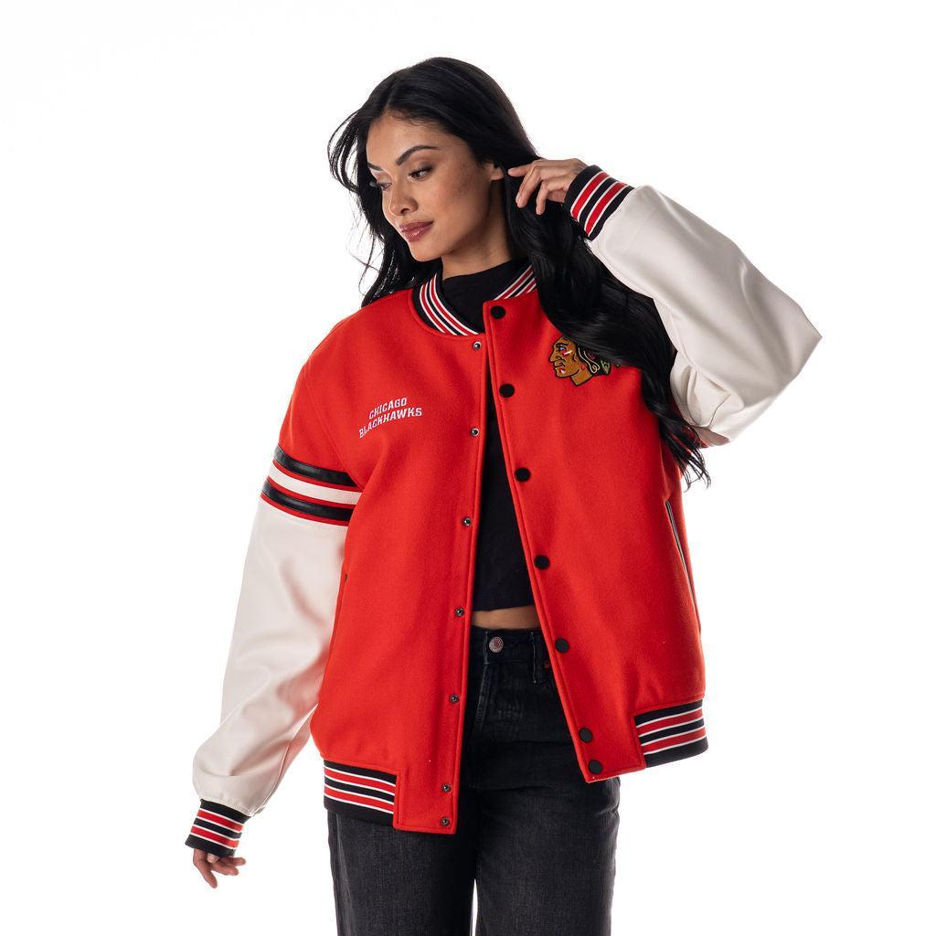 This Chicago Blackhawks varsity jacket features a classic drop shoulder fit with eye-catching team details throughout—from the embroidered logos on the front to the oversized back graphic that makes a statement from every angle. Designed in a bright red body with contrast white faux leather sleeves and striped accents, it’s a modern take on vintage game day style.