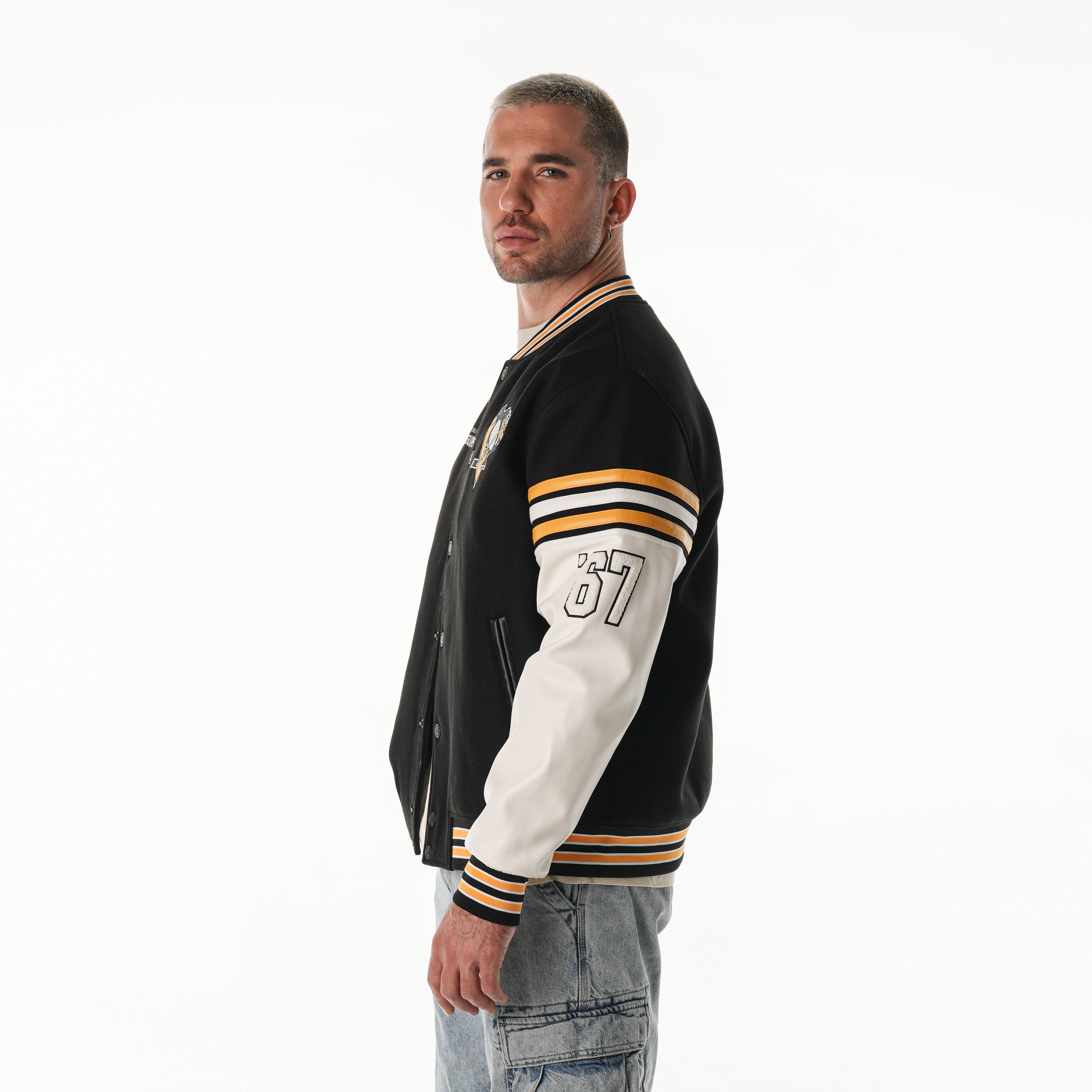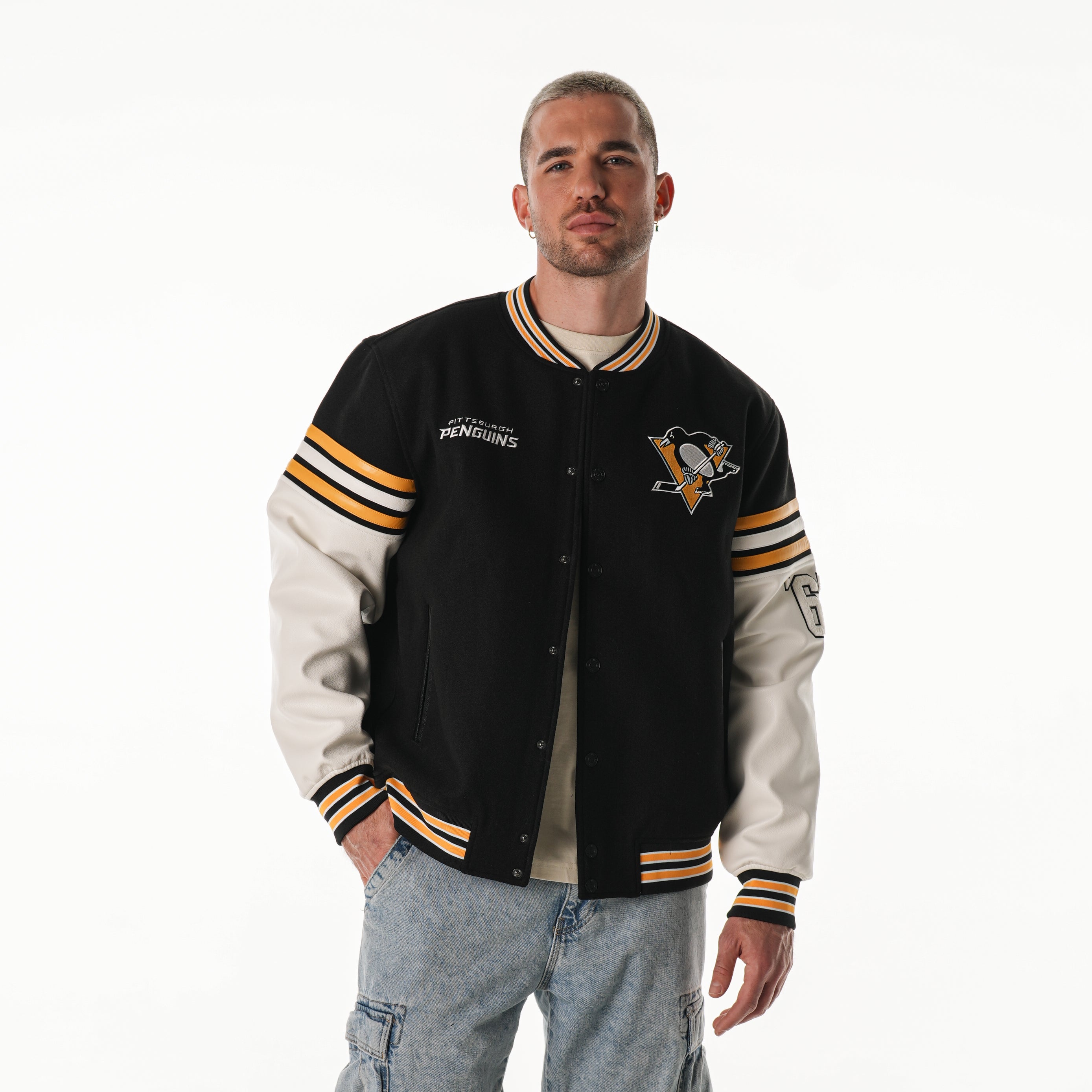Rep the Penguins with a bold statement piece that blends vintage vibes with varsity style. This drop shoulder jacket features a sleek black body with contrast white sleeves and bold gold striping throughout. The oversized back logo and embroidered front accents showcase your team pride, while the ‘67 sleeve patch nods to the team's founding year. Finished with a full snap button front and striped ribbed trim, it’s built to stand out.