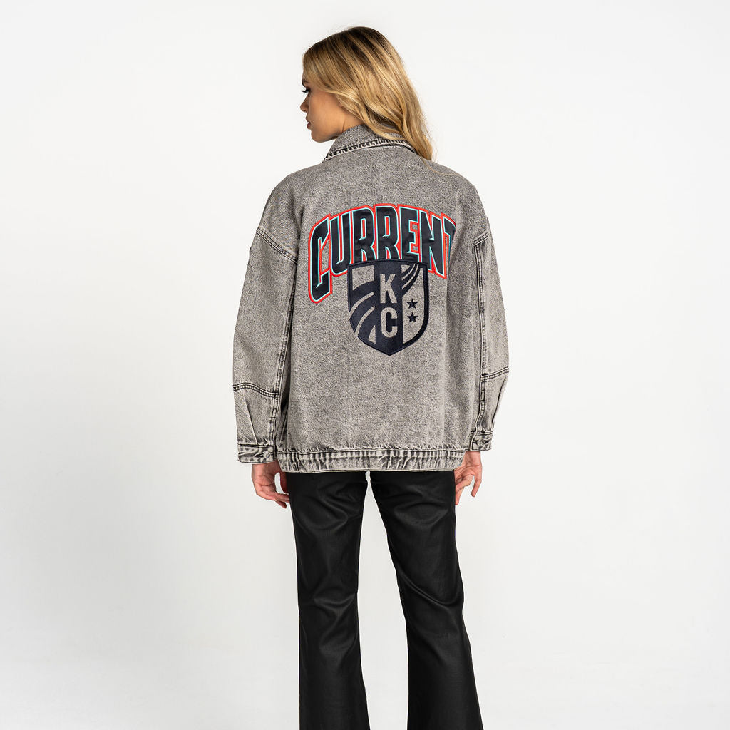 A classic denim jacket featuring Kansas City Current graphics for a clean, versatile look. The oversized women’s fit makes it perfect for layering across seasons. Model is wearing a size small.