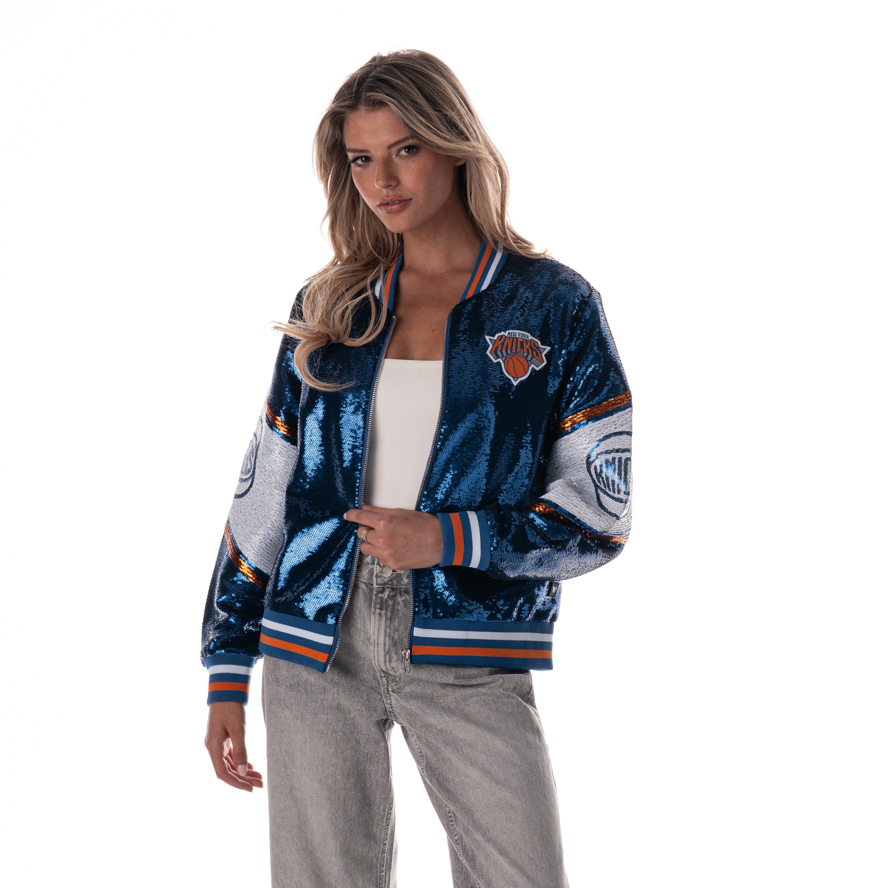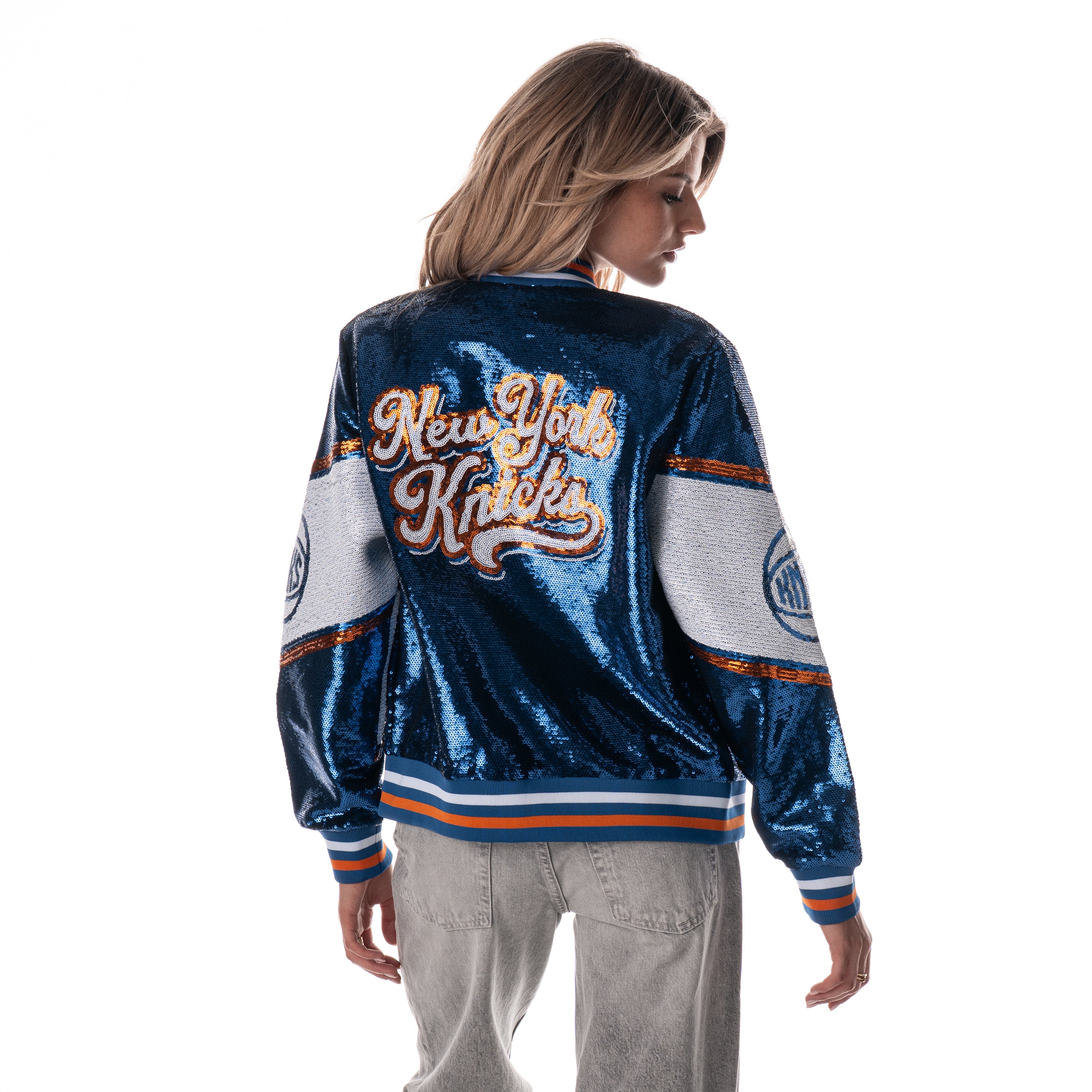 A statement Knicks jacket that delivers shine and team pride. This sequin bomber features bold Knicks details across the front, sleeves, and back, finished with striped rib trims. Easy to style and built to stand out on game day or any day.