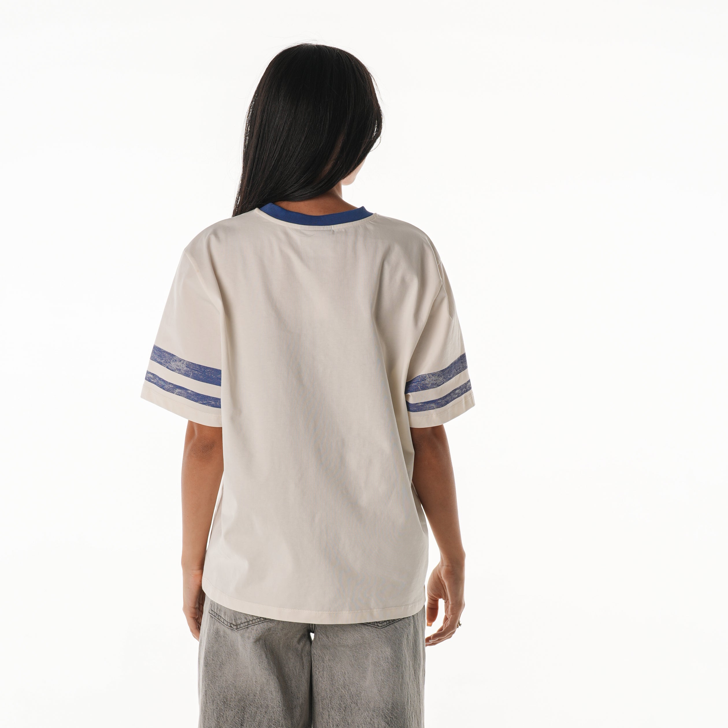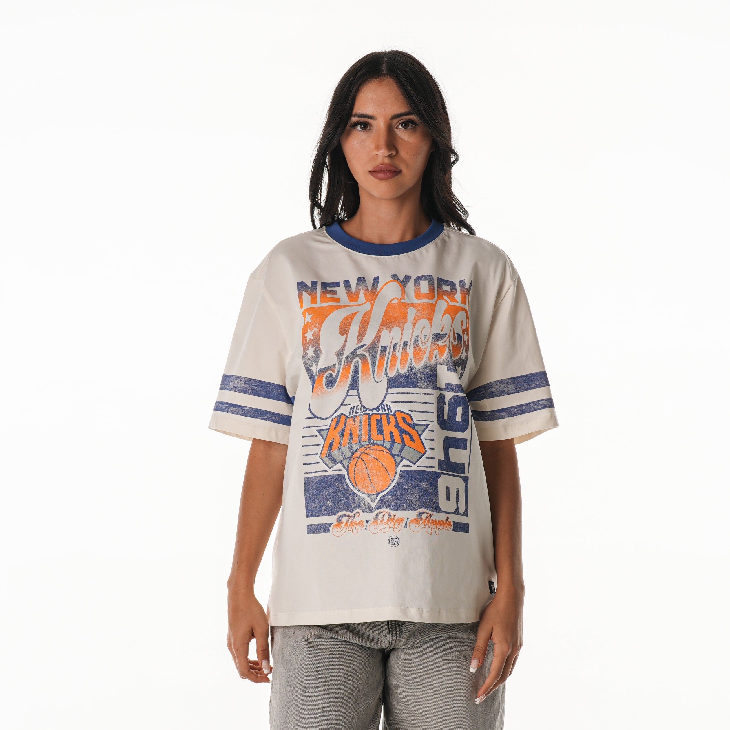 A cream drop-shoulder tee with a relaxed fit and a bold vintage-style Knicks graphic across the front. Easy everyday look you can pair with anything.