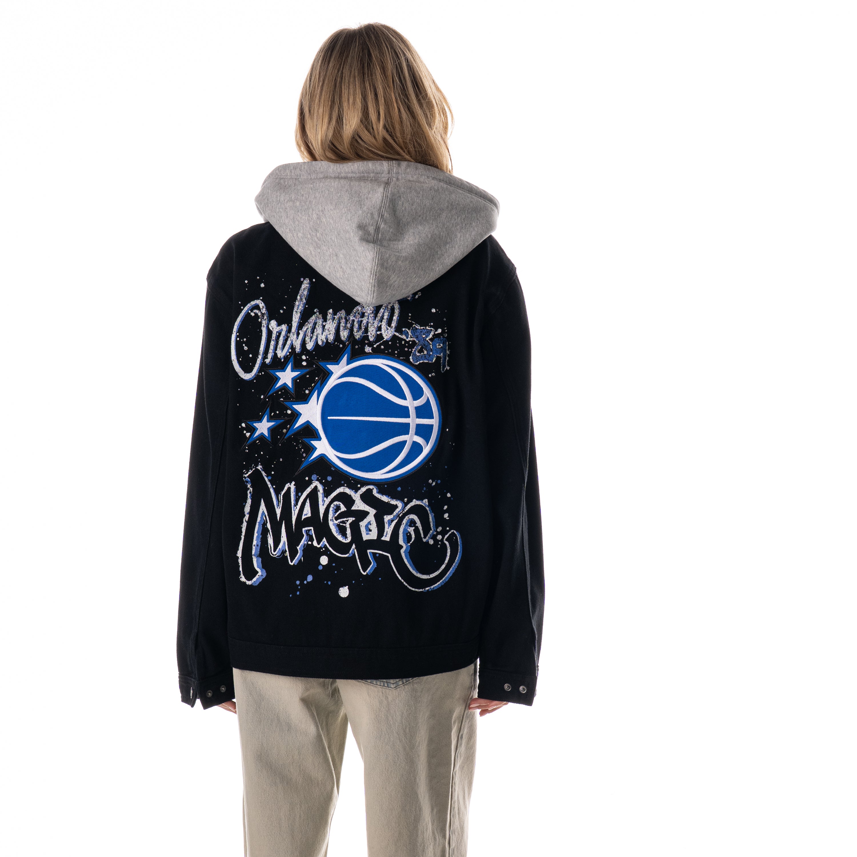A relaxed black denim jacket with a built-in fleece hood and bold Orlando Magic artwork across the back. The front keeps it clean with a small team hit on the chest, while the back brings all the energy with oversized graphics and a splatter-style design. Easy to layer, easy to wear, and made for everyday game-day fits.