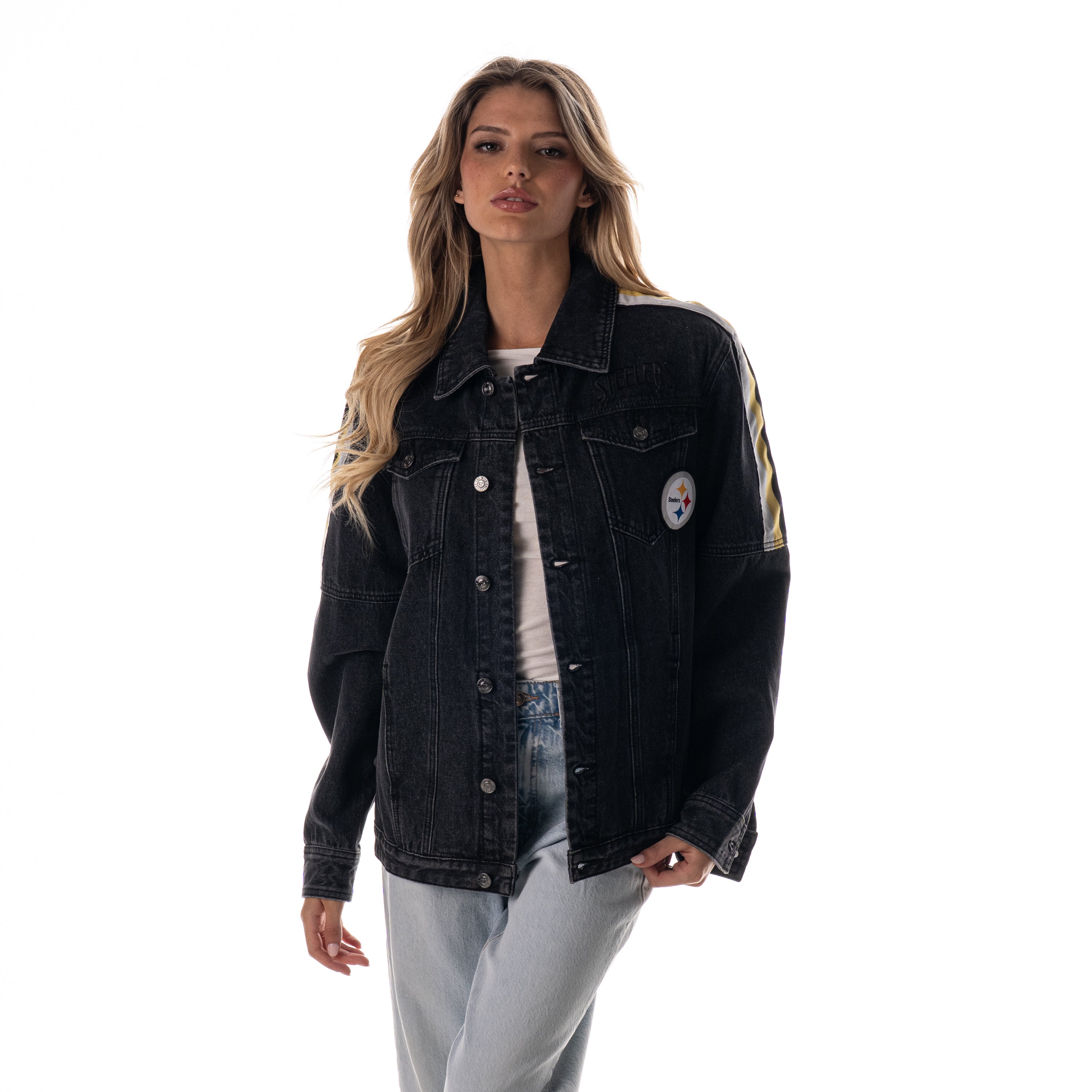 Rep the Steelers in this black denim jacket, featuring studded back graphics and shoulder stripe details for a bold game day look.
