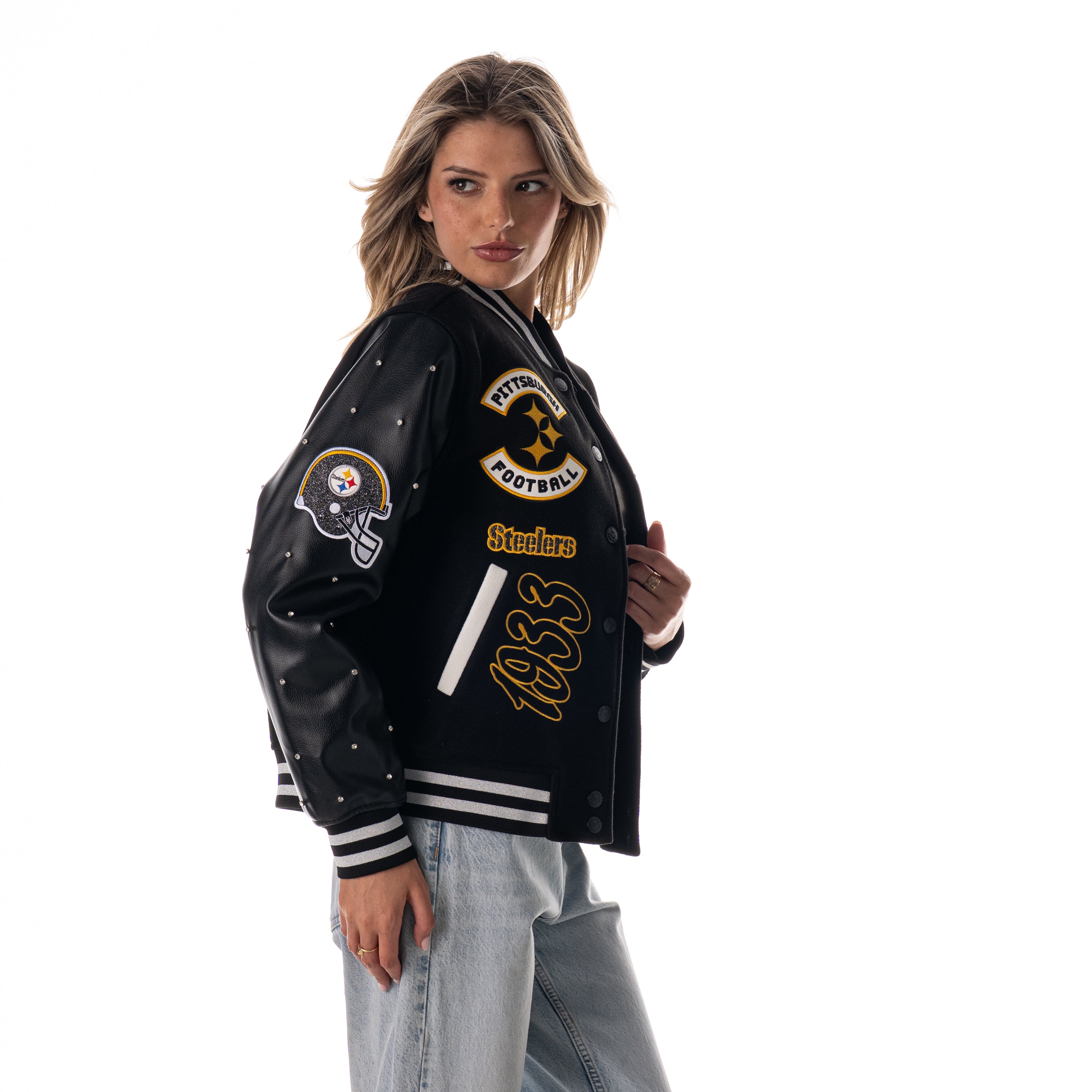 Shine bright on game day with this Steelers sparkle jacket. Featuring studded sleeves, bold team patches, and statement graphics, it’s the ultimate mix of edge and fan pride.