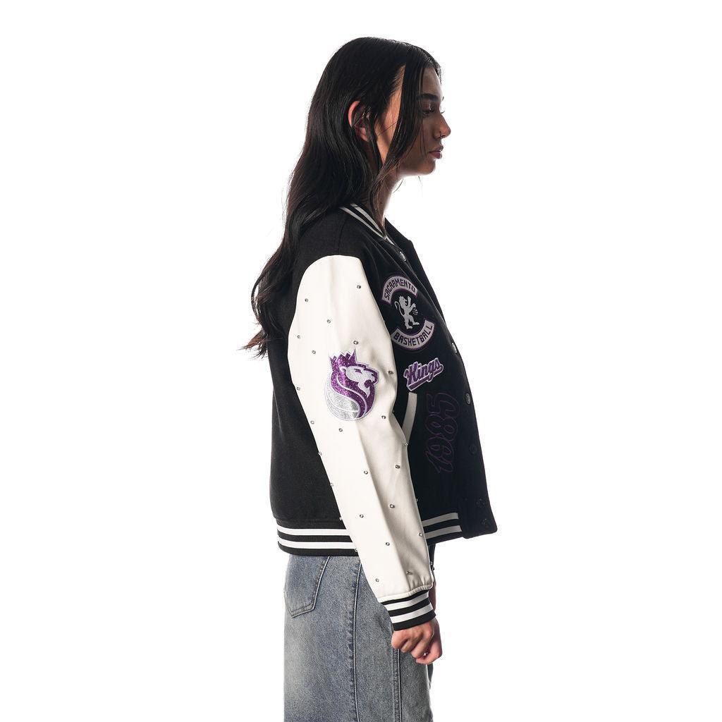 The Sacramento Kings Sparkle Varsity Jacket in black showcases bold team branding with eye-catching sparkle details. This jacket offers a stylish and unique way to support the Kings, perfect for any fan looking to stand out.