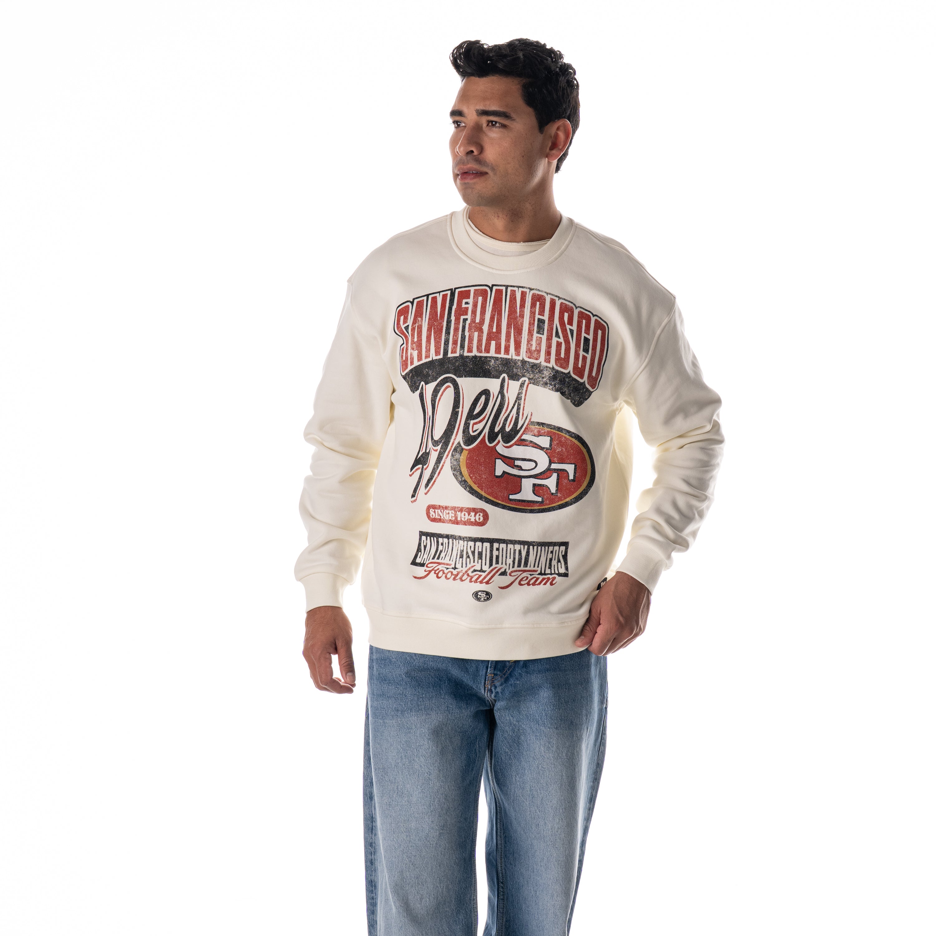 Channel retro football vibes with this vintage-inspired crew fleece. Designed in a soft vintage white tone, it features bold front graphics with the 49ers logo, helmet artwork, and heritage lettering that nods to the team’s legacy since 1946. Striped rib-knit cuffs and hem add a throwback athletic feel, while the oversized fit makes it the perfect blend of comfort and style for game day or everyday wear.