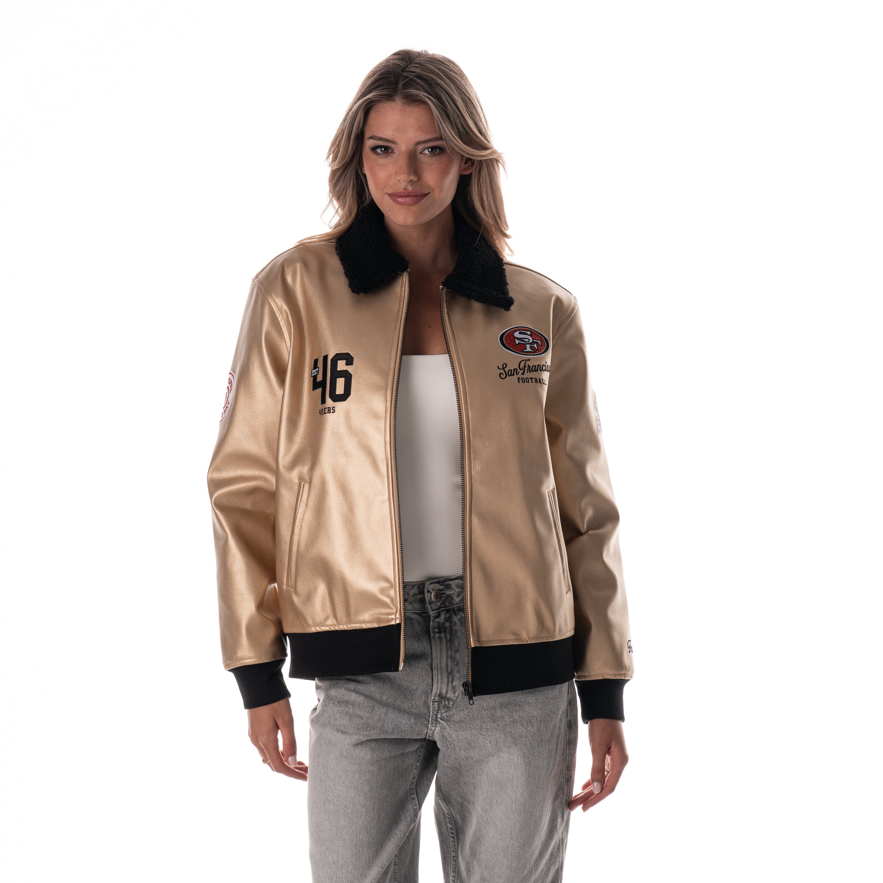 Rep the Niners in bold fashion with this metallic bomber. Designed in a statement gold finish, it features San Francisco logos on the front, sleeves, and back, paired with a contrast black collar and cuffs for a modern edge.