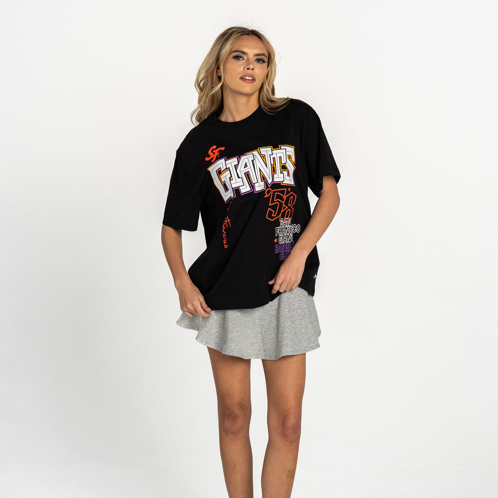 A black graphic tee featuring San Francisco Giants artwork for a bold, vintage-inspired look. The classic fit makes it an easy everyday staple. Model is wearing a size large.