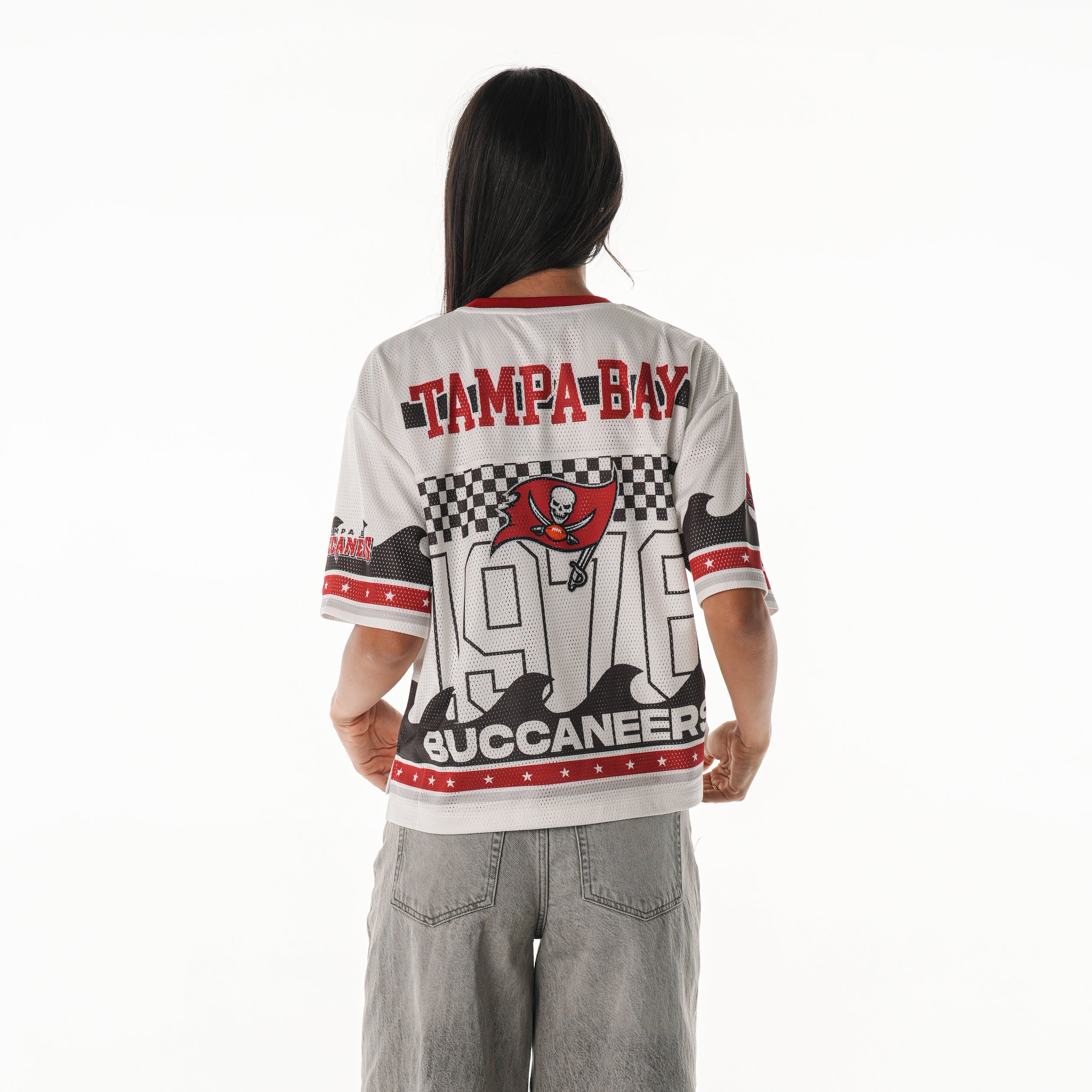 Bring the energy of game day anywhere you go. This mesh jersey-style top features bold Buccaneers graphics, checker detailing, and team slogans for a statement look that stands out. Designed with a cropped fit and breathable mesh fabric that keeps you cool and comfortable all season long.