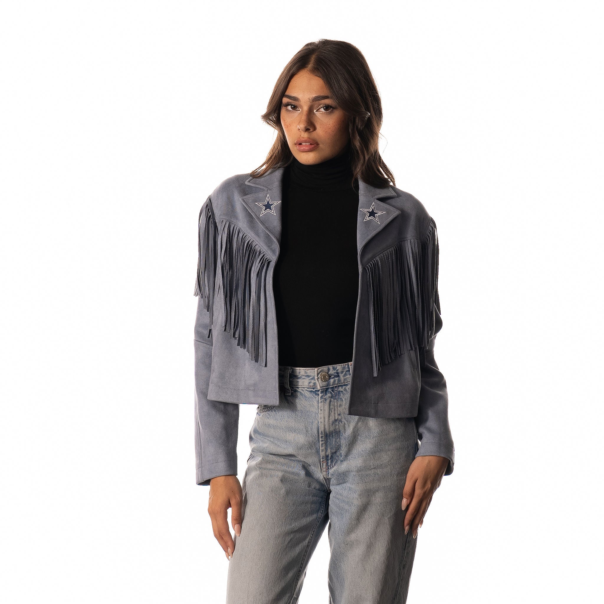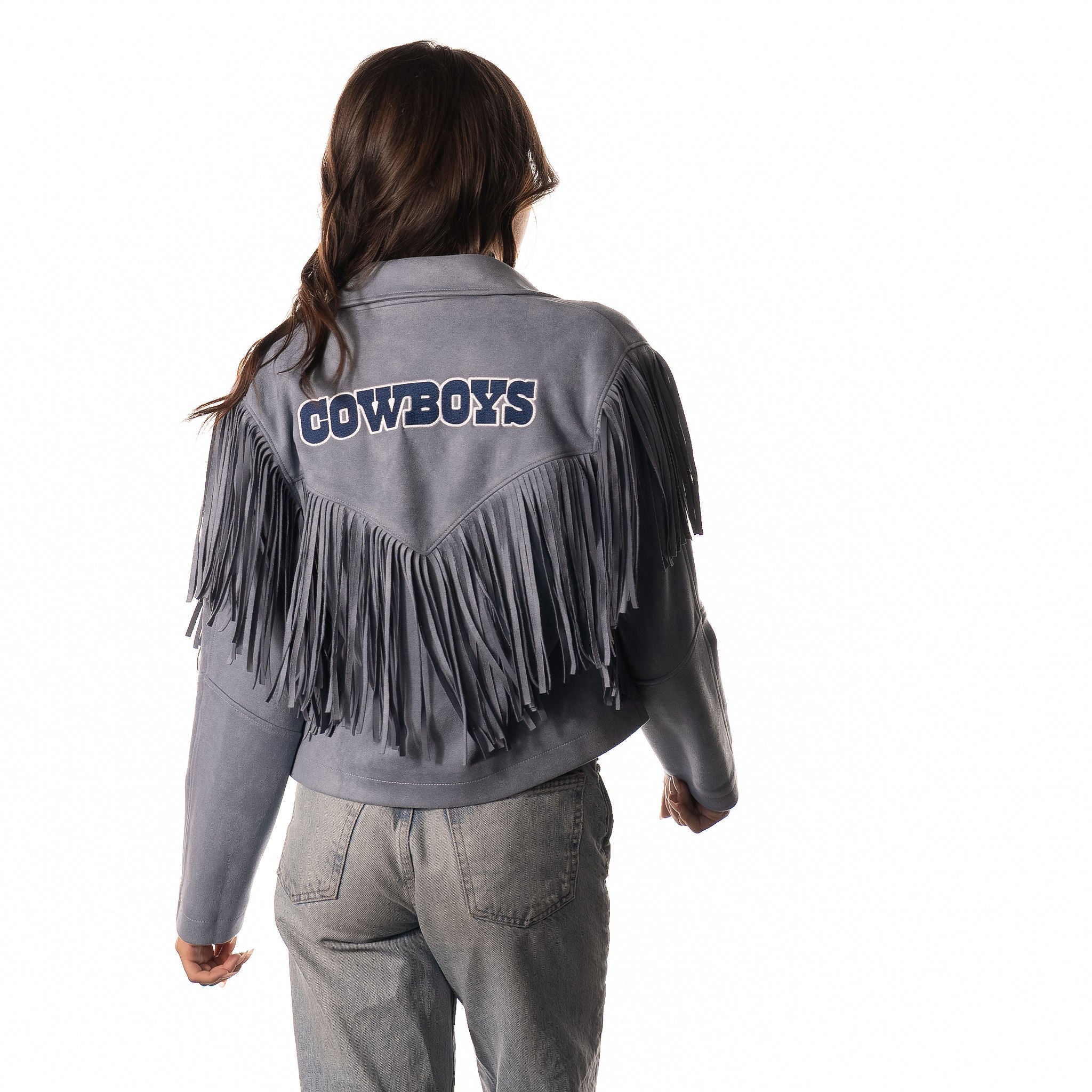 Our Cowboys Suede Fringe Jacket is one of the latest additions in our Fall 2023 collection. Premium suede is designed with iconic detailing including signature Dallas Cowboys motifs and styled fringe.