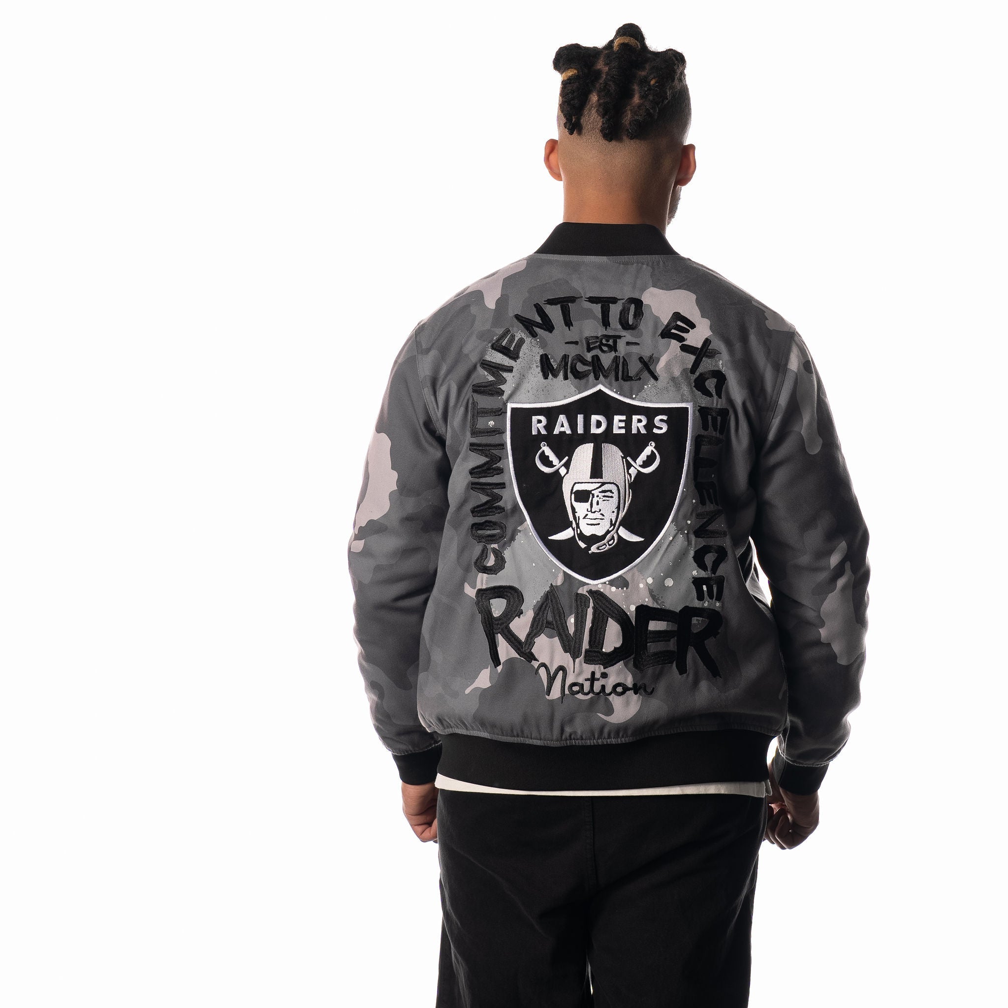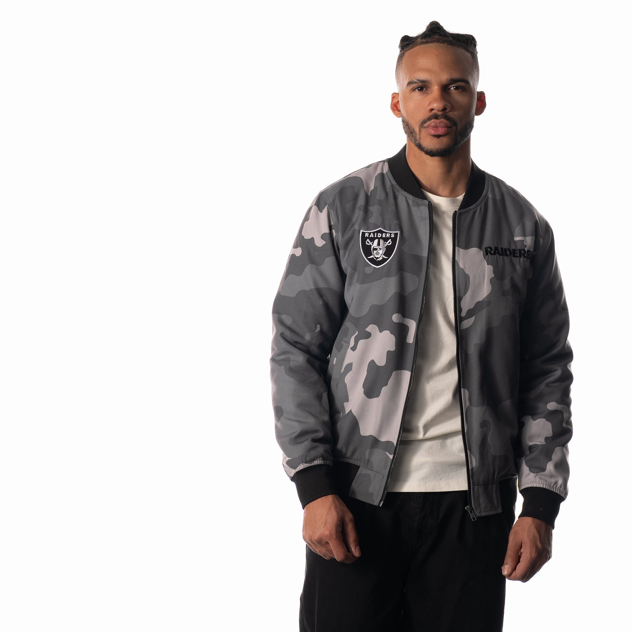 Finding your game-day fit just got easier with our Raiders Camo Bomber. It's premium composition highlights signature branding with a mix of unique artwork for a modern touch. Each design is finished with a zipper closure and comfortable ribbed trims at the cuffs and collar.