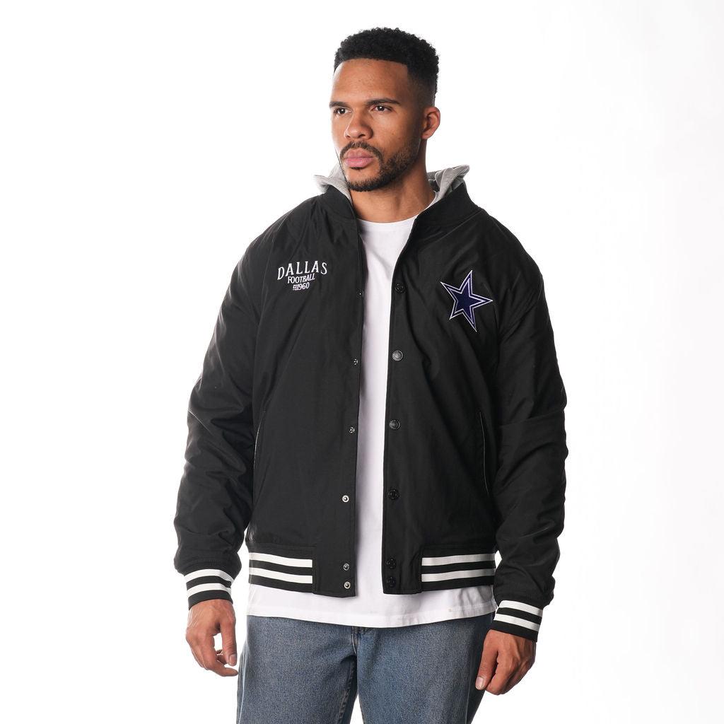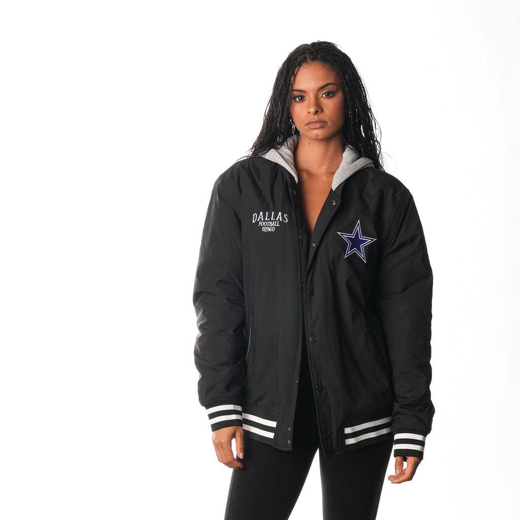 Stay warm in style with the Dallas Cowboys Hooded Bomber Jacket. This sleek black jacket features the iconic Dallas Cowboys logo and a comfortable hood.
